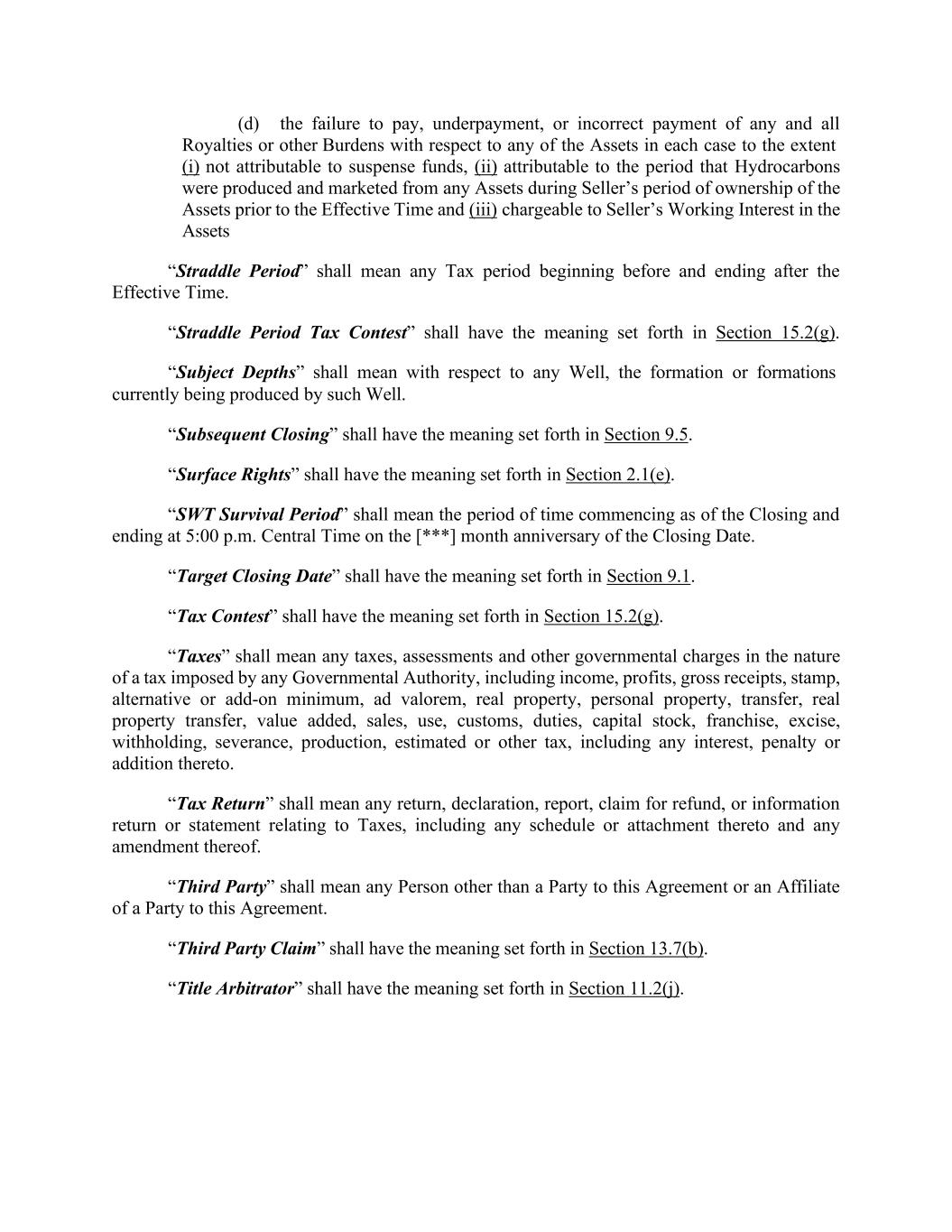 (d) the failure to pay, underpayment, or incorrect payment of any and all Royalties or other Burdens with respect to any of the Assets in each case to the extent (i) not attributable to suspense funds, (ii) attributable to the period that Hydrocarbons were produced and marketed from any Assets during Seller’s period of ownership of the Assets prior to the Effective Time and (iii) chargeable to Seller’s Working Interest in the Assets “Straddle Period” shall mean any Tax period beginning before and ending after the Effective Time. “Straddle Period Tax Contest” shall have the meaning set forth in Section 15.2(g). “Subject Depths” shall mean with respect to any Well, the formation or formations currently being produced by such Well. “Subsequent Closing” shall have the meaning set forth in Section 9.5. “Surface Rights” shall have the meaning set forth in Section 2.1(e). “SWT Survival Period” shall mean the period of time commencing as of the Closing and ending at 5:00 p.m. Central Time on the [***] month anniversary of the Closing Date. “Target Closing Date” shall have the meaning set forth in Section 9.1. “Tax Contest” shall have the meaning set forth in Section 15.2(g). “Taxes” shall mean any taxes, assessments and other governmental charges in the nature of a tax imposed by any Governmental Authority, including income, profits, gross receipts, stamp, alternative or add-on minimum, ad valorem, real property, personal property, transfer, real property transfer, value added, sales, use, customs, duties, capital stock, franchise, excise, withholding, severance, production, estimated or other tax, including any interest, penalty or addition thereto. “Tax Return” shall mean any return, declaration, report, claim for refund, or information return or statement relating to Taxes, including any schedule or attachment thereto and any amendment thereof. “Third Party” shall mean any Person other than a Party to this Agreement or an Affiliate of a Party to this Agreement. “Third Party Claim” shall have the meaning set forth in Section 13.7(b). “Title Arbitrator” shall have the meaning set forth in Section 11.2(j).