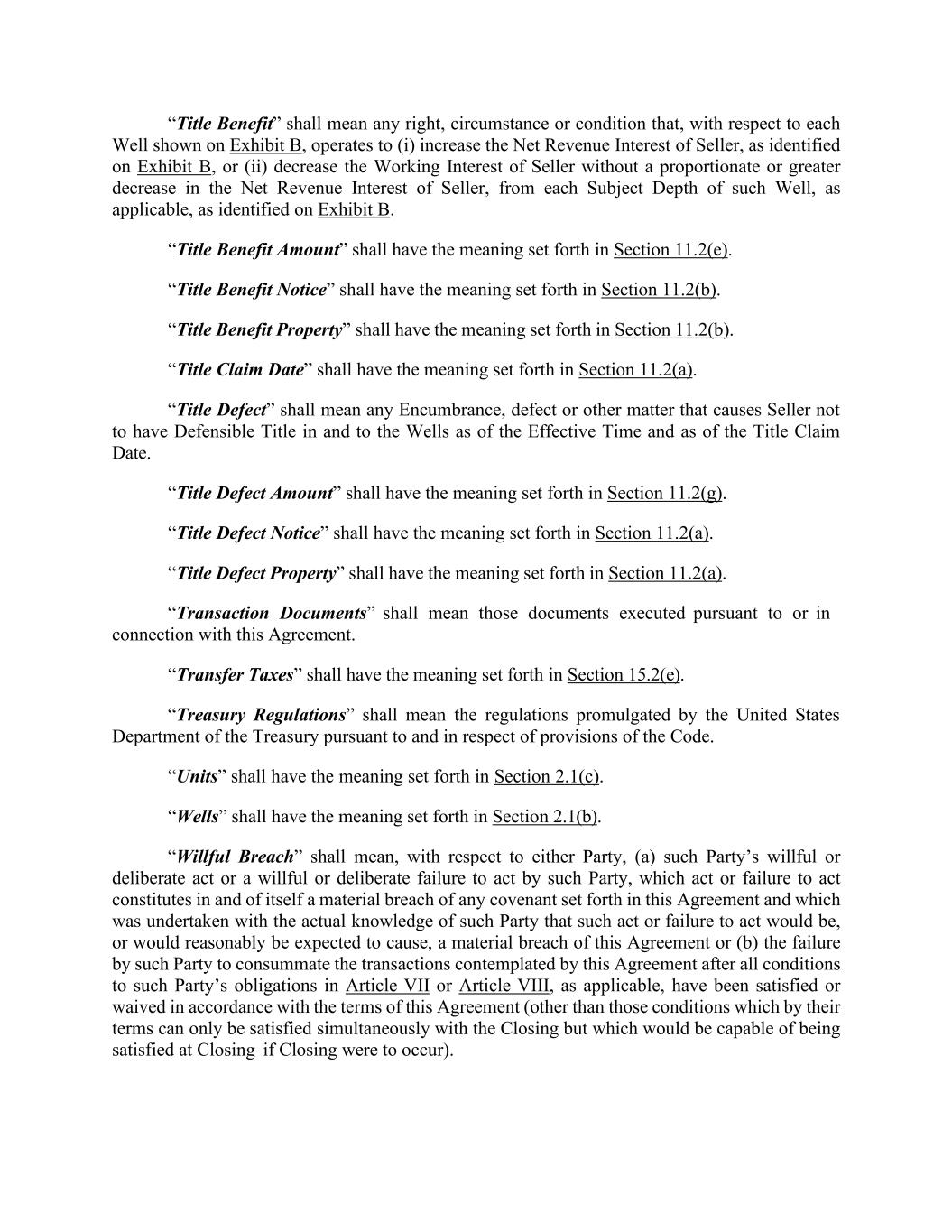 “Title Benefit” shall mean any right, circumstance or condition that, with respect to each Well shown on Exhibit B, operates to (i) increase the Net Revenue Interest of Seller, as identified on Exhibit B, or (ii) decrease the Working Interest of Seller without a proportionate or greater decrease in the Net Revenue Interest of Seller, from each Subject Depth of such Well, as applicable, as identified on Exhibit B. “Title Benefit Amount” shall have the meaning set forth in Section 11.2(e). “Title Benefit Notice” shall have the meaning set forth in Section 11.2(b). “Title Benefit Property” shall have the meaning set forth in Section 11.2(b). “Title Claim Date” shall have the meaning set forth in Section 11.2(a). “Title Defect” shall mean any Encumbrance, defect or other matter that causes Seller not to have Defensible Title in and to the Wells as of the Effective Time and as of the Title Claim Date. “Title Defect Amount” shall have the meaning set forth in Section 11.2(g). “Title Defect Notice” shall have the meaning set forth in Section 11.2(a). “Title Defect Property” shall have the meaning set forth in Section 11.2(a). “Transaction Documents” shall mean those documents executed pursuant to or in connection with this Agreement. “Transfer Taxes” shall have the meaning set forth in Section 15.2(e). “Treasury Regulations” shall mean the regulations promulgated by the United States Department of the Treasury pursuant to and in respect of provisions of the Code. “Units” shall have the meaning set forth in Section 2.1(c). “Wells” shall have the meaning set forth in Section 2.1(b). “Willful Breach” shall mean, with respect to either Party, (a) such Party’s willful or deliberate act or a willful or deliberate failure to act by such Party, which act or failure to act constitutes in and of itself a material breach of any covenant set forth in this Agreement and which was undertaken with the actual knowledge of such Party that such act or failure to act would be, or would reasonably be expected to cause, a material breach of this Agreement or (b) the failure by such Party to consummate the transactions contemplated by this Agreement after all conditions to such Party’s obligations in Article VII or Article VIII, as applicable, have been satisfied or waived in accordance with the terms of this Agreement (other than those conditions which by their terms can only be satisfied simultaneously with the Closing but which would be capable of being satisfied at Closing if Closing were to occur).