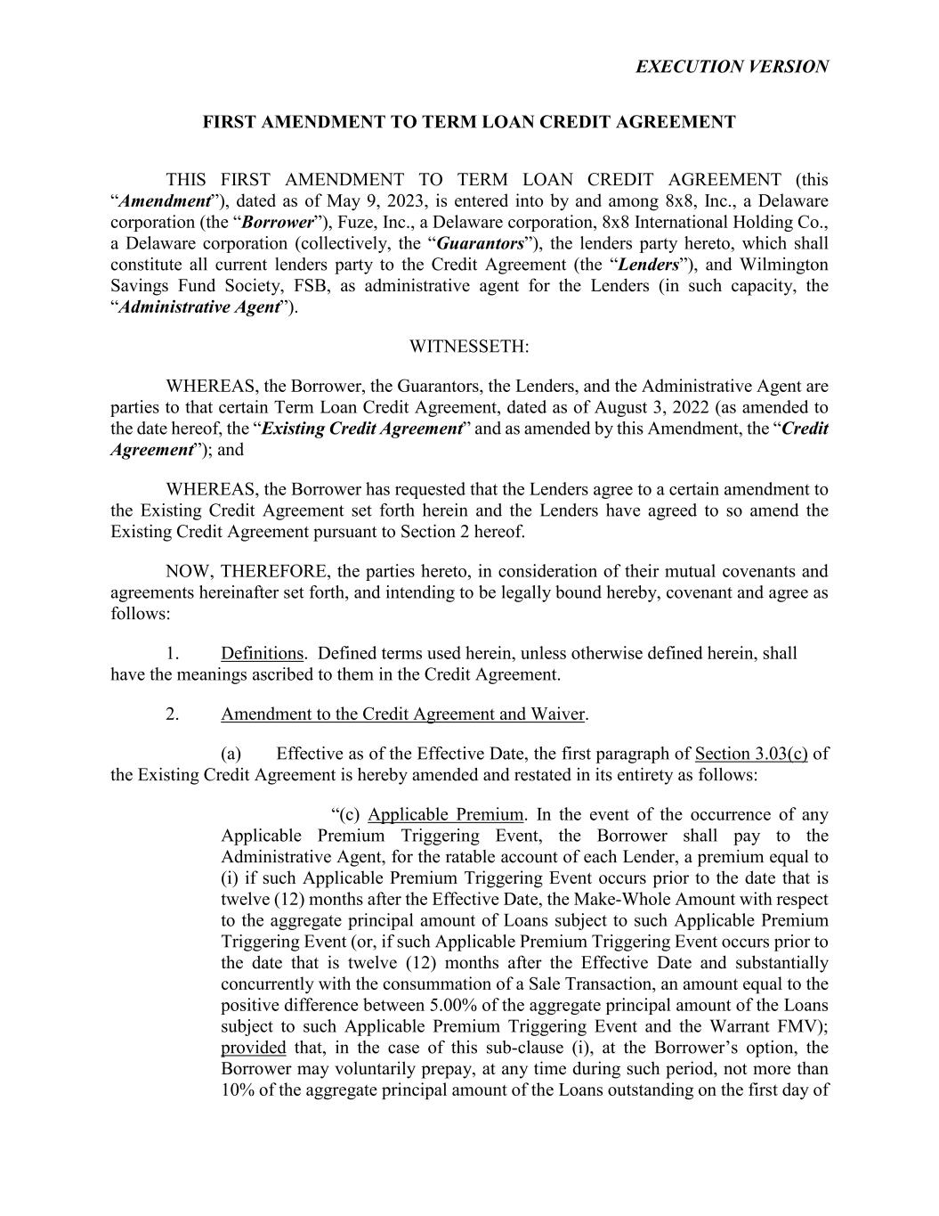 EXECUTION VERSION FIRST AMENDMENT TO TERM LOAN CREDIT AGREEMENT THIS FIRST AMENDMENT TO TERM LOAN CREDIT AGREEMENT (this “Amendment”), dated as of May 9, 2023, is entered into by and among 8x8, Inc., a Delaware corporation (the “Borrower”), Fuze, Inc., a Delaware corporation, 8x8 International Holding Co., a Delaware corporation (collectively, the “Guarantors”), the lenders party hereto, which shall constitute all current lenders party to the Credit Agreement (the “Lenders”), and Wilmington Savings Fund Society, FSB, as administrative agent for the Lenders (in such capacity, the “Administrative Agent”). WITNESSETH: WHEREAS, the Borrower, the Guarantors, the Lenders, and the Administrative Agent are parties to that certain Term Loan Credit Agreement, dated as of August 3, 2022 (as amended to the date hereof, the “Existing Credit Agreement” and as amended by this Amendment, the “Credit Agreement”); and WHEREAS, the Borrower has requested that the Lenders agree to a certain amendment to the Existing Credit Agreement set forth herein and the Lenders have agreed to so amend the Existing Credit Agreement pursuant to Section 2 hereof. NOW, THEREFORE, the parties hereto, in consideration of their mutual covenants and agreements hereinafter set forth, and intending to be legally bound hereby, covenant and agree as follows: 1. Definitions. Defined terms used herein, unless otherwise defined herein, shall have the meanings ascribed to them in the Credit Agreement. 2. Amendment to the Credit Agreement and Waiver. (a) Effective as of the Effective Date, the first paragraph of Section 3.03(c) of the Existing Credit Agreement is hereby amended and restated in its entirety as follows: “(c) Applicable Premium. In the event of the occurrence of any Applicable Premium Triggering Event, the Borrower shall pay to the Administrative Agent, for the ratable account of each Lender, a premium equal to (i) if such Applicable Premium Triggering Event occurs prior to the date that is twelve (12) months after the Effective Date, the Make-Whole Amount with respect to the aggregate principal amount of Loans subject to such Applicable Premium Triggering Event (or, if such Applicable Premium Triggering Event occurs prior to the date that is twelve (12) months after the Effective Date and substantially concurrently with the consummation of a Sale Transaction, an amount equal to the positive difference between 5.00% of the aggregate principal amount of the Loans subject to such Applicable Premium Triggering Event and the Warrant FMV); provided that, in the case of this sub-clause (i), at the Borrower’s option, the Borrower may voluntarily prepay, at any time during such period, not more than 10% of the aggregate principal amount of the Loans outstanding on the first day of
