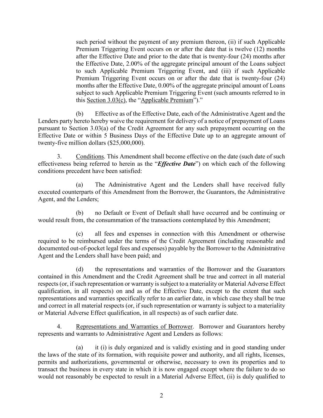 2 such period without the payment of any premium thereon, (ii) if such Applicable Premium Triggering Event occurs on or after the date that is twelve (12) months after the Effective Date and prior to the date that is twenty-four (24) months after the Effective Date, 2.00% of the aggregate principal amount of the Loans subject to such Applicable Premium Triggering Event, and (iii) if such Applicable Premium Triggering Event occurs on or after the date that is twenty-four (24) months after the Effective Date, 0.00% of the aggregate principal amount of Loans subject to such Applicable Premium Triggering Event (such amounts referred to in this Section 3.03(c), the “Applicable Premium”).” (b) Effective as of the Effective Date, each of the Administrative Agent and the Lenders party hereto hereby waive the requirement for delivery of a notice of prepayment of Loans pursuant to Section 3.03(a) of the Credit Agreement for any such prepayment occurring on the Effective Date or within 5 Business Days of the Effective Date up to an aggregate amount of twenty-five million dollars ($25,000,000). 3. Conditions. This Amendment shall become effective on the date (such date of such effectiveness being referred to herein as the “Effective Date”) on which each of the following conditions precedent have been satisfied: (a) The Administrative Agent and the Lenders shall have received fully executed counterparts of this Amendment from the Borrower, the Guarantors, the Administrative Agent, and the Lenders; (b) no Default or Event of Default shall have occurred and be continuing or would result from, the consummation of the transactions contemplated by this Amendment; (c) all fees and expenses in connection with this Amendment or otherwise required to be reimbursed under the terms of the Credit Agreement (including reasonable and documented out-of-pocket legal fees and expenses) payable by the Borrower to the Administrative Agent and the Lenders shall have been paid; and (d) the representations and warranties of the Borrower and the Guarantors contained in this Amendment and the Credit Agreement shall be true and correct in all material respects (or, if such representation or warranty is subject to a materiality or Material Adverse Effect qualification, in all respects) on and as of the Effective Date, except to the extent that such representations and warranties specifically refer to an earlier date, in which case they shall be true and correct in all material respects (or, if such representation or warranty is subject to a materiality or Material Adverse Effect qualification, in all respects) as of such earlier date. 4. Representations and Warranties of Borrower. Borrower and Guarantors hereby represents and warrants to Administrative Agent and Lenders as follows: (a) it (i) is duly organized and is validly existing and in good standing under the laws of the state of its formation, with requisite power and authority, and all rights, licenses, permits and authorizations, governmental or otherwise, necessary to own its properties and to transact the business in every state in which it is now engaged except where the failure to do so would not reasonably be expected to result in a Material Adverse Effect, (ii) is duly qualified to