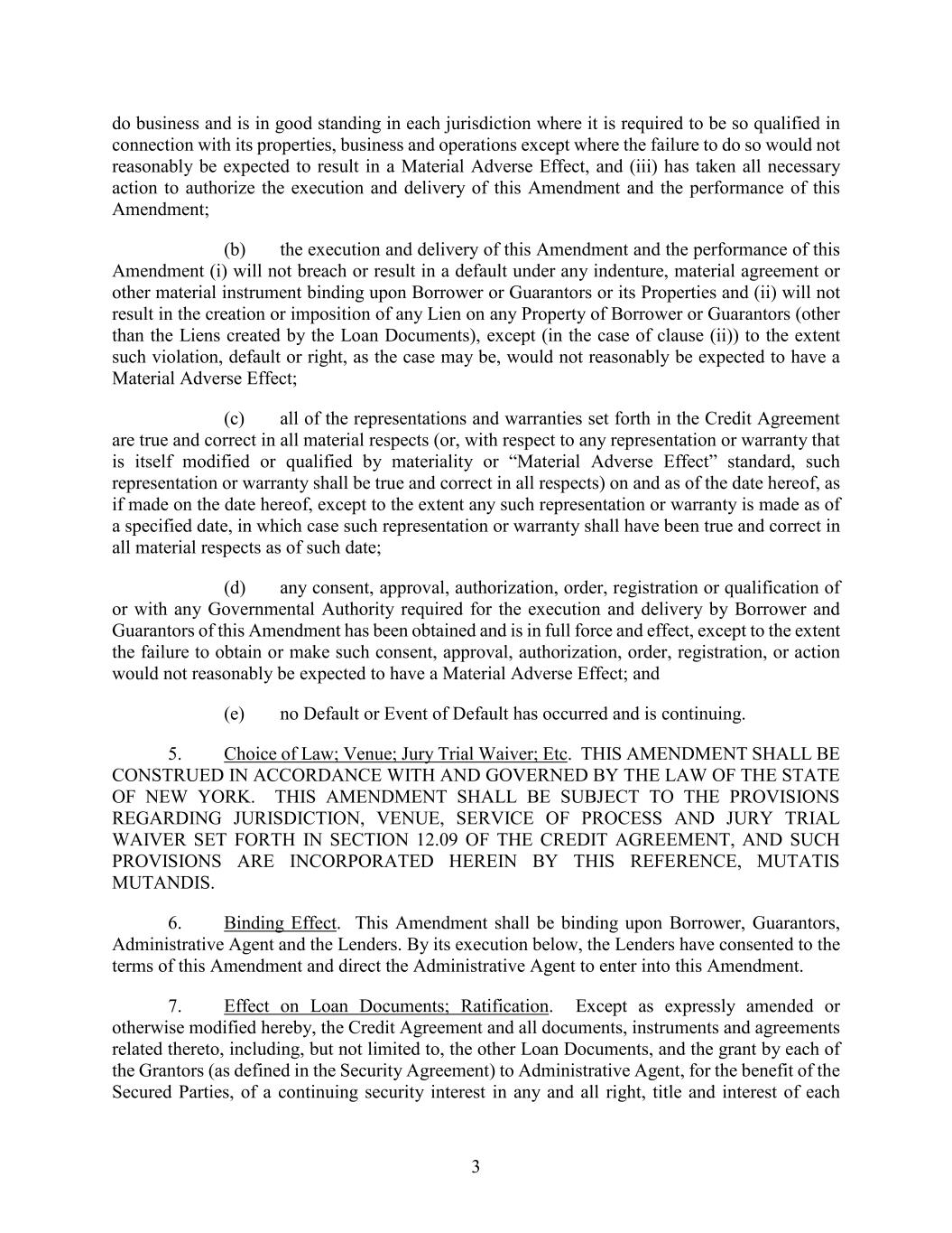 3 do business and is in good standing in each jurisdiction where it is required to be so qualified in connection with its properties, business and operations except where the failure to do so would not reasonably be expected to result in a Material Adverse Effect, and (iii) has taken all necessary action to authorize the execution and delivery of this Amendment and the performance of this Amendment; (b) the execution and delivery of this Amendment and the performance of this Amendment (i) will not breach or result in a default under any indenture, material agreement or other material instrument binding upon Borrower or Guarantors or its Properties and (ii) will not result in the creation or imposition of any Lien on any Property of Borrower or Guarantors (other than the Liens created by the Loan Documents), except (in the case of clause (ii)) to the extent such violation, default or right, as the case may be, would not reasonably be expected to have a Material Adverse Effect; (c) all of the representations and warranties set forth in the Credit Agreement are true and correct in all material respects (or, with respect to any representation or warranty that is itself modified or qualified by materiality or “Material Adverse Effect” standard, such representation or warranty shall be true and correct in all respects) on and as of the date hereof, as if made on the date hereof, except to the extent any such representation or warranty is made as of a specified date, in which case such representation or warranty shall have been true and correct in all material respects as of such date; (d) any consent, approval, authorization, order, registration or qualification of or with any Governmental Authority required for the execution and delivery by Borrower and Guarantors of this Amendment has been obtained and is in full force and effect, except to the extent the failure to obtain or make such consent, approval, authorization, order, registration, or action would not reasonably be expected to have a Material Adverse Effect; and (e) no Default or Event of Default has occurred and is continuing. 5. Choice of Law; Venue; Jury Trial Waiver; Etc. THIS AMENDMENT SHALL BE CONSTRUED IN ACCORDANCE WITH AND GOVERNED BY THE LAW OF THE STATE OF NEW YORK. THIS AMENDMENT SHALL BE SUBJECT TO THE PROVISIONS REGARDING JURISDICTION, VENUE, SERVICE OF PROCESS AND JURY TRIAL WAIVER SET FORTH IN SECTION 12.09 OF THE CREDIT AGREEMENT, AND SUCH PROVISIONS ARE INCORPORATED HEREIN BY THIS REFERENCE, MUTATIS MUTANDIS. 6. Binding Effect. This Amendment shall be binding upon Borrower, Guarantors, Administrative Agent and the Lenders. By its execution below, the Lenders have consented to the terms of this Amendment and direct the Administrative Agent to enter into this Amendment. 7. Effect on Loan Documents; Ratification. Except as expressly amended or otherwise modified hereby, the Credit Agreement and all documents, instruments and agreements related thereto, including, but not limited to, the other Loan Documents, and the grant by each of the Grantors (as defined in the Security Agreement) to Administrative Agent, for the benefit of the Secured Parties, of a continuing security interest in any and all right, title and interest of each
