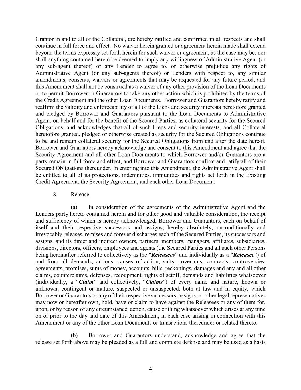 4 Grantor in and to all of the Collateral, are hereby ratified and confirmed in all respects and shall continue in full force and effect. No waiver herein granted or agreement herein made shall extend beyond the terms expressly set forth herein for such waiver or agreement, as the case may be, nor shall anything contained herein be deemed to imply any willingness of Administrative Agent (or any sub-agent thereof) or any Lender to agree to, or otherwise prejudice any rights of Administrative Agent (or any sub-agents thereof) or Lenders with respect to, any similar amendments, consents, waivers or agreements that may be requested for any future period, and this Amendment shall not be construed as a waiver of any other provision of the Loan Documents or to permit Borrower or Guarantors to take any other action which is prohibited by the terms of the Credit Agreement and the other Loan Documents. Borrower and Guarantors hereby ratify and reaffirm the validity and enforceability of all of the Liens and security interests heretofore granted and pledged by Borrower and Guarantors pursuant to the Loan Documents to Administrative Agent, on behalf and for the benefit of the Secured Parties, as collateral security for the Secured Obligations, and acknowledges that all of such Liens and security interests, and all Collateral heretofore granted, pledged or otherwise created as security for the Secured Obligations continue to be and remain collateral security for the Secured Obligations from and after the date hereof. Borrower and Guarantors hereby acknowledge and consent to this Amendment and agree that the Security Agreement and all other Loan Documents to which Borrower and/or Guarantors are a party remain in full force and effect, and Borrower and Guarantors confirm and ratify all of their Secured Obligations thereunder. In entering into this Amendment, the Administrative Agent shall be entitled to all of its protections, indemnities, immunities and rights set forth in the Existing Credit Agreement, the Security Agreement, and each other Loan Document. 8. Release. (a) In consideration of the agreements of the Administrative Agent and the Lenders party hereto contained herein and for other good and valuable consideration, the receipt and sufficiency of which is hereby acknowledged, Borrower and Guarantors, each on behalf of itself and their respective successors and assigns, hereby absolutely, unconditionally and irrevocably releases, remises and forever discharges each of the Secured Parties, its successors and assigns, and its direct and indirect owners, partners, members, managers, affiliates, subsidiaries, divisions, directors, officers, employees and agents (the Secured Parties and all such other Persons being hereinafter referred to collectively as the “Releasees” and individually as a “Releasee”) of and from all demands, actions, causes of action, suits, covenants, contracts, controversies, agreements, promises, sums of money, accounts, bills, reckonings, damages and any and all other claims, counterclaims, defenses, recoupment, rights of setoff, demands and liabilities whatsoever (individually, a “Claim” and collectively, “Claims”) of every name and nature, known or unknown, contingent or mature, suspected or unsuspected, both at law and in equity, which Borrower or Guarantors or any of their respective successors, assigns, or other legal representatives may now or hereafter own, hold, have or claim to have against the Releasees or any of them for, upon, or by reason of any circumstance, action, cause or thing whatsoever which arises at any time on or prior to the day and date of this Amendment, in each case arising in connection with this Amendment or any of the other Loan Documents or transactions thereunder or related thereto. (b) Borrower and Guarantors understand, acknowledge and agree that the release set forth above may be pleaded as a full and complete defense and may be used as a basis