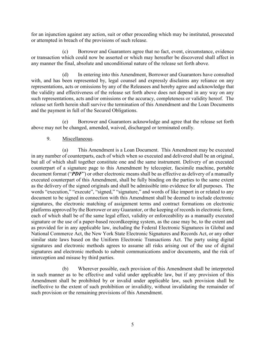5 for an injunction against any action, suit or other proceeding which may be instituted, prosecuted or attempted in breach of the provisions of such release. (c) Borrower and Guarantors agree that no fact, event, circumstance, evidence or transaction which could now be asserted or which may hereafter be discovered shall affect in any manner the final, absolute and unconditional nature of the release set forth above. (d) In entering into this Amendment, Borrower and Guarantors have consulted with, and has been represented by, legal counsel and expressly disclaims any reliance on any representations, acts or omissions by any of the Releasees and hereby agree and acknowledge that the validity and effectiveness of the release set forth above does not depend in any way on any such representations, acts and/or omissions or the accuracy, completeness or validity hereof. The release set forth herein shall survive the termination of this Amendment and the Loan Documents and the payment in full of the Secured Obligations. (e) Borrower and Guarantors acknowledge and agree that the release set forth above may not be changed, amended, waived, discharged or terminated orally. 9. Miscellaneous. (a) This Amendment is a Loan Document. This Amendment may be executed in any number of counterparts, each of which when so executed and delivered shall be an original, but all of which shall together constitute one and the same instrument. Delivery of an executed counterpart of a signature page to this Amendment by telecopier, facsimile machine, portable document format (“PDF”) or other electronic means shall be as effective as delivery of a manually executed counterpart of this Amendment, shall be fully binding on the parties to the same extent as the delivery of the signed originals and shall be admissible into evidence for all purposes. The words “execution,” “execute”, “signed,” “signature,” and words of like import in or related to any document to be signed in connection with this Amendment shall be deemed to include electronic signatures, the electronic matching of assignment terms and contract formations on electronic platforms approved by the Borrower or any Guarantor, or the keeping of records in electronic form, each of which shall be of the same legal effect, validity or enforceability as a manually executed signature or the use of a paper-based recordkeeping system, as the case may be, to the extent and as provided for in any applicable law, including the Federal Electronic Signatures in Global and National Commerce Act, the New York State Electronic Signatures and Records Act, or any other similar state laws based on the Uniform Electronic Transactions Act. The party using digital signatures and electronic methods agrees to assume all risks arising out of the use of digital signatures and electronic methods to submit communications and/or documents, and the risk of interception and misuse by third parties. (b) Wherever possible, each provision of this Amendment shall be interpreted in such manner as to be effective and valid under applicable law, but if any provision of this Amendment shall be prohibited by or invalid under applicable law, such provision shall be ineffective to the extent of such prohibition or invalidity, without invalidating the remainder of such provision or the remaining provisions of this Amendment.