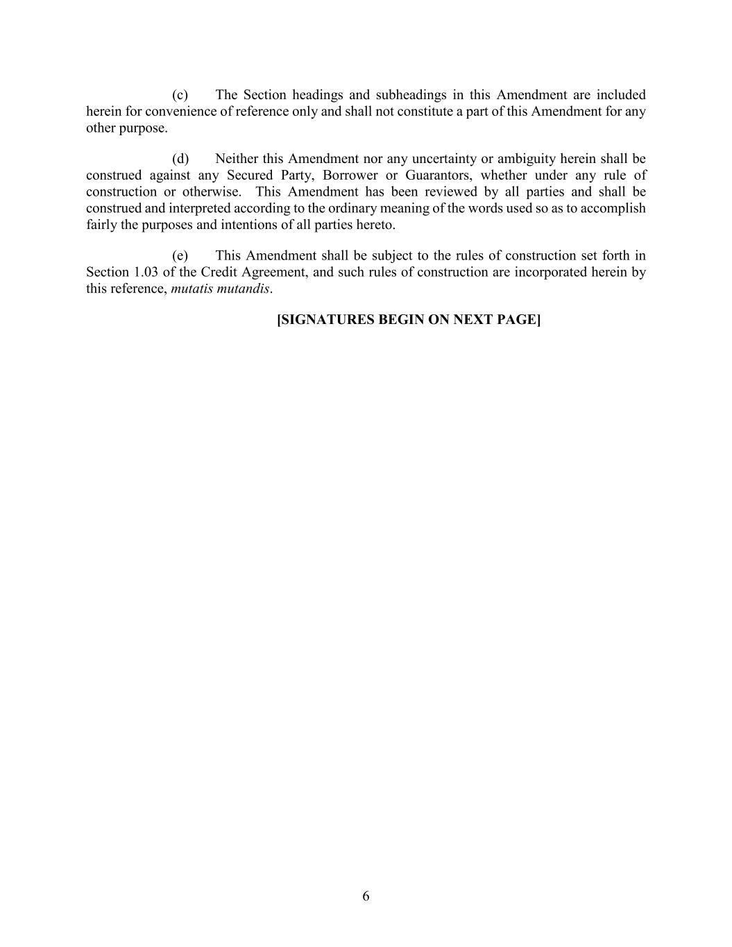 6 (c) The Section headings and subheadings in this Amendment are included herein for convenience of reference only and shall not constitute a part of this Amendment for any other purpose. (d) Neither this Amendment nor any uncertainty or ambiguity herein shall be construed against any Secured Party, Borrower or Guarantors, whether under any rule of construction or otherwise. This Amendment has been reviewed by all parties and shall be construed and interpreted according to the ordinary meaning of the words used so as to accomplish fairly the purposes and intentions of all parties hereto. (e) This Amendment shall be subject to the rules of construction set forth in Section 1.03 of the Credit Agreement, and such rules of construction are incorporated herein by this reference, mutatis mutandis. [SIGNATURES BEGIN ON NEXT PAGE]