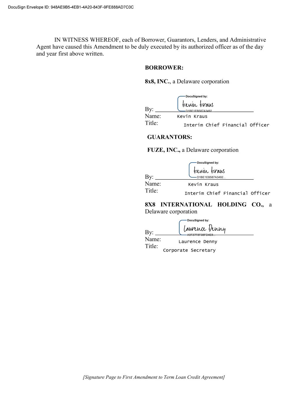 [Signature Page to First Amendment to Term Loan Credit Agreement] IN WITNESS WHEREOF, each of Borrower, Guarantors, Lenders, and Administrative Agent have caused this Amendment to be duly executed by its authorized officer as of the day and year first above written. BORROWER: 8x8, INC., a Delaware corporation By: Name: Title: GUARANTORS: FUZE, INC., a Delaware corporation By: Name: Title: 8X8 INTERNATIONAL HOLDING CO., a Delaware corporation By: Name: Title: