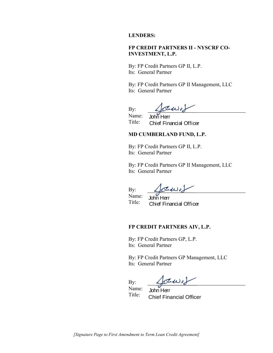 [Signature Page to First Amendment to Term Loan Credit Agreement] LENDERS: FP CREDIT PARTNERS II - NYSCRF CO- INVESTMENT, L.P. By: FP Credit Partners GP II, L.P. Its: General Partner By: FP Credit Partners GP II Management, LLC Its: General Partner By: Name: Title: MD CUMBERLAND FUND, L.P. By: FP Credit Partners GP II, L.P. Its: General Partner By: FP Credit Partners GP II Management, LLC Its: General Partner By: Name: Title: FP CREDIT PARTNERS AIV, L.P. By: FP Credit Partners GP, L.P. Its: General Partner By: FP Credit Partners GP Management, LLC Its: General Partner By: Name: Title: John Herr Chief Financial Officer John Herr Chief Financial Officer John Herr Chief Financial Officer