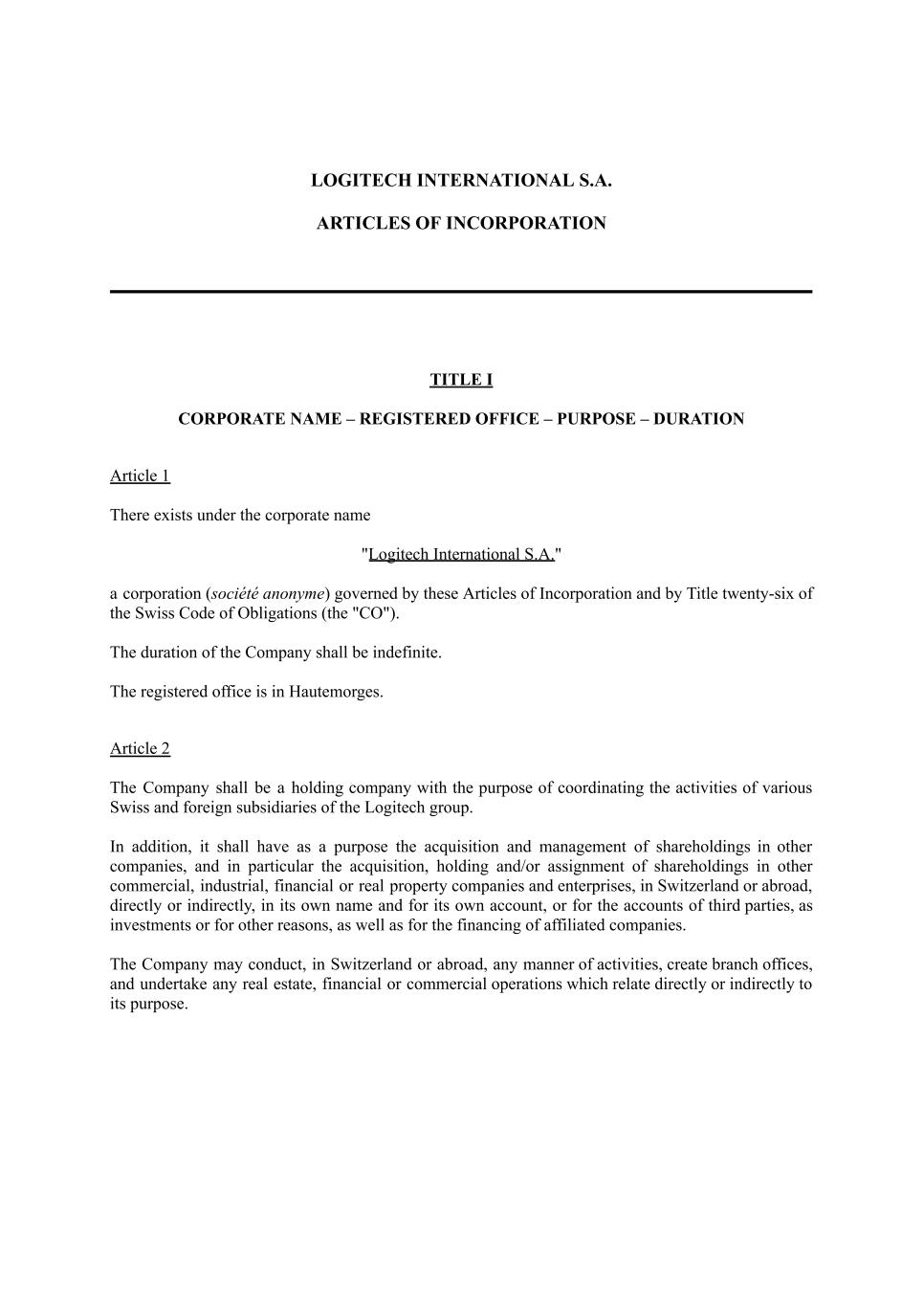 LOGITECH INTERNATIONAL S.A. ARTICLES OF INCORPORATION TITLE I CORPORATE NAME – REGISTERED OFFICE – PURPOSE – DURATION Article 1 There exists under the corporate name "Logitech International S.A." a corporation (société anonyme) governed by these Articles of Incorporation and by Title twenty-six of the Swiss Code of Obligations (the "CO"). The duration of the Company shall be indefinite. The registered office is in Hautemorges. Article 2 The Company shall be a holding company with the purpose of coordinating the activities of various Swiss and foreign subsidiaries of the Logitech group. In addition, it shall have as a purpose the acquisition and management of shareholdings in other companies, and in particular the acquisition, holding and/or assignment of shareholdings in other commercial, industrial, financial or real property companies and enterprises, in Switzerland or abroad, directly or indirectly, in its own name and for its own account, or for the accounts of third parties, as investments or for other reasons, as well as for the financing of affiliated companies. The Company may conduct, in Switzerland or abroad, any manner of activities, create branch offices, and undertake any real estate, financial or commercial operations which relate directly or indirectly to its purpose.