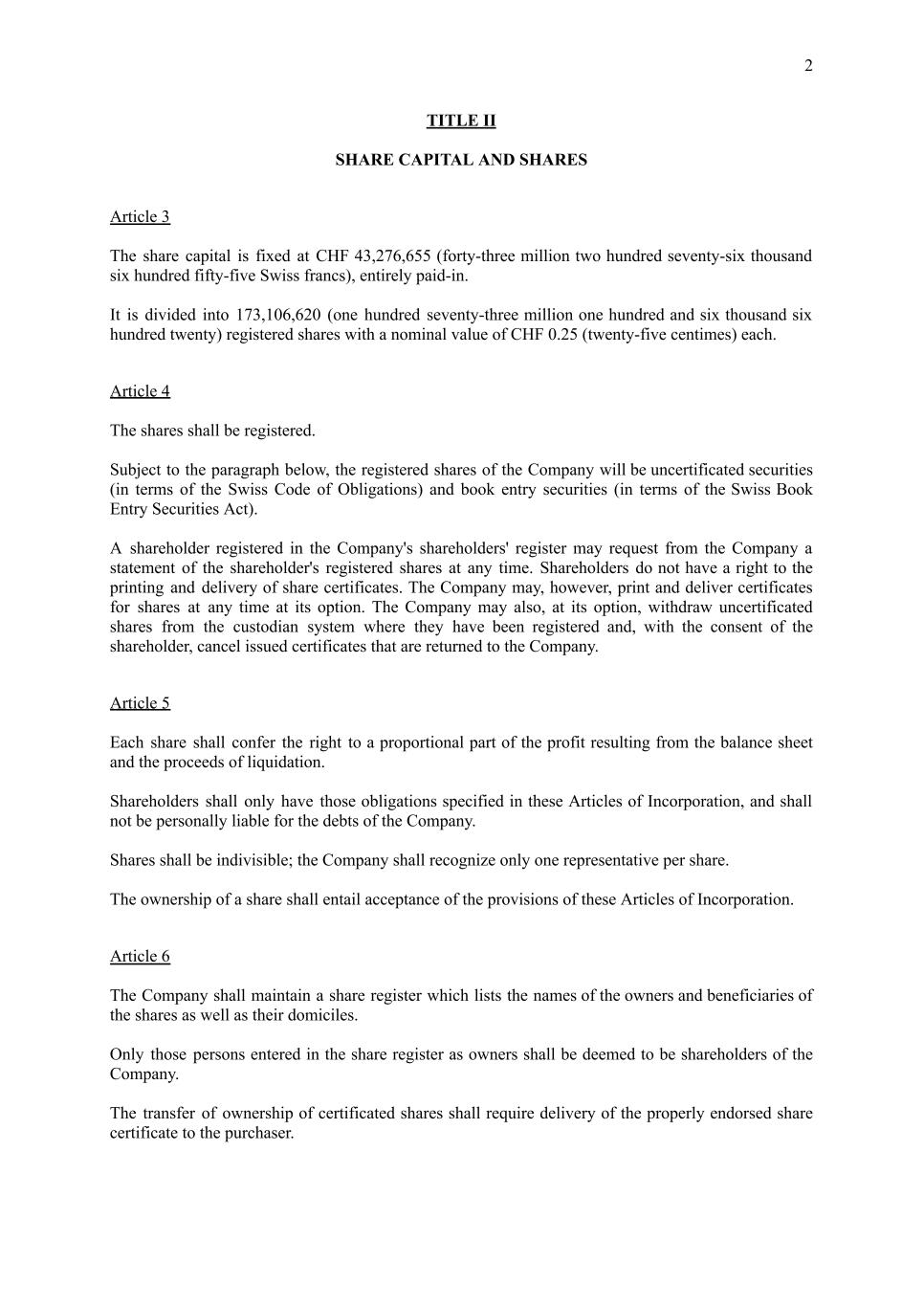 2 TITLE II SHARE CAPITAL AND SHARES Article 3 The share capital is fixed at CHF 43,276,655 (forty-three million two hundred seventy-six thousand six hundred fifty-five Swiss francs), entirely paid-in. It is divided into 173,106,620 (one hundred seventy-three million one hundred and six thousand six hundred twenty) registered shares with a nominal value of CHF 0.25 (twenty-five centimes) each. Article 4 The shares shall be registered. Subject to the paragraph below, the registered shares of the Company will be uncertificated securities (in terms of the Swiss Code of Obligations) and book entry securities (in terms of the Swiss Book Entry Securities Act). A shareholder registered in the Company's shareholders' register may request from the Company a statement of the shareholder's registered shares at any time. Shareholders do not have a right to the printing and delivery of share certificates. The Company may, however, print and deliver certificates for shares at any time at its option. The Company may also, at its option, withdraw uncertificated shares from the custodian system where they have been registered and, with the consent of the shareholder, cancel issued certificates that are returned to the Company. Article 5 Each share shall confer the right to a proportional part of the profit resulting from the balance sheet and the proceeds of liquidation. Shareholders shall only have those obligations specified in these Articles of Incorporation, and shall not be personally liable for the debts of the Company. Shares shall be indivisible; the Company shall recognize only one representative per share. The ownership of a share shall entail acceptance of the provisions of these Articles of Incorporation. Article 6 The Company shall maintain a share register which lists the names of the owners and beneficiaries of the shares as well as their domiciles. Only those persons entered in the share register as owners shall be deemed to be shareholders of the Company. The transfer of ownership of certificated shares shall require delivery of the properly endorsed share certificate to the purchaser.