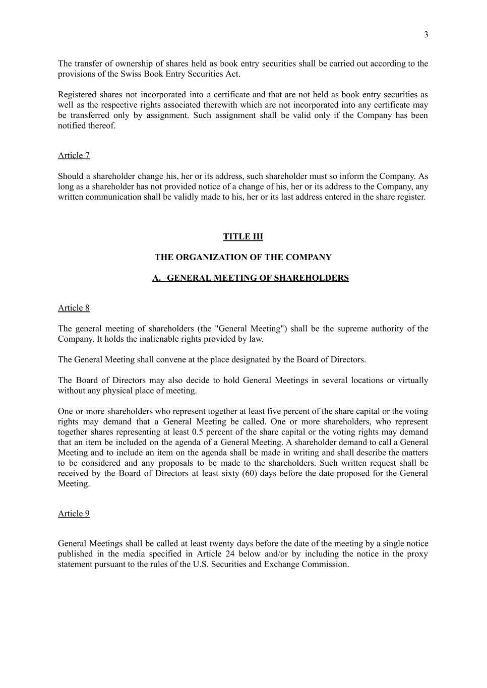 3 The transfer of ownership of shares held as book entry securities shall be carried out according to the provisions of the Swiss Book Entry Securities Act. Registered shares not incorporated into a certificate and that are not held as book entry securities as well as the respective rights associated therewith which are not incorporated into any certificate may be transferred only by assignment. Such assignment shall be valid only if the Company has been notified thereof. Article 7 Should a shareholder change his, her or its address, such shareholder must so inform the Company. As long as a shareholder has not provided notice of a change of his, her or its address to the Company, any written communication shall be validly made to his, her or its last address entered in the share register. TITLE III THE ORGANIZATION OF THE COMPANY A. GENERAL MEETING OF SHAREHOLDERS Article 8 The general meeting of shareholders (the "General Meeting") shall be the supreme authority of the Company. It holds the inalienable rights provided by law. The General Meeting shall convene at the place designated by the Board of Directors. The Board of Directors may also decide to hold General Meetings in several locations or virtually without any physical place of meeting. One or more shareholders who represent together at least five percent of the share capital or the voting rights may demand that a General Meeting be called. One or more shareholders, who represent together shares representing at least 0.5 percent of the share capital or the voting rights may demand that an item be included on the agenda of a General Meeting. A shareholder demand to call a General Meeting and to include an item on the agenda shall be made in writing and shall describe the matters to be considered and any proposals to be made to the shareholders. Such written request shall be received by the Board of Directors at least sixty (60) days before the date proposed for the General Meeting. Article 9 General Meetings shall be called at least twenty days before the date of the meeting by a single notice published in the media specified in Article 24 below and/or by including the notice in the proxy statement pursuant to the rules of the U.S. Securities and Exchange Commission.