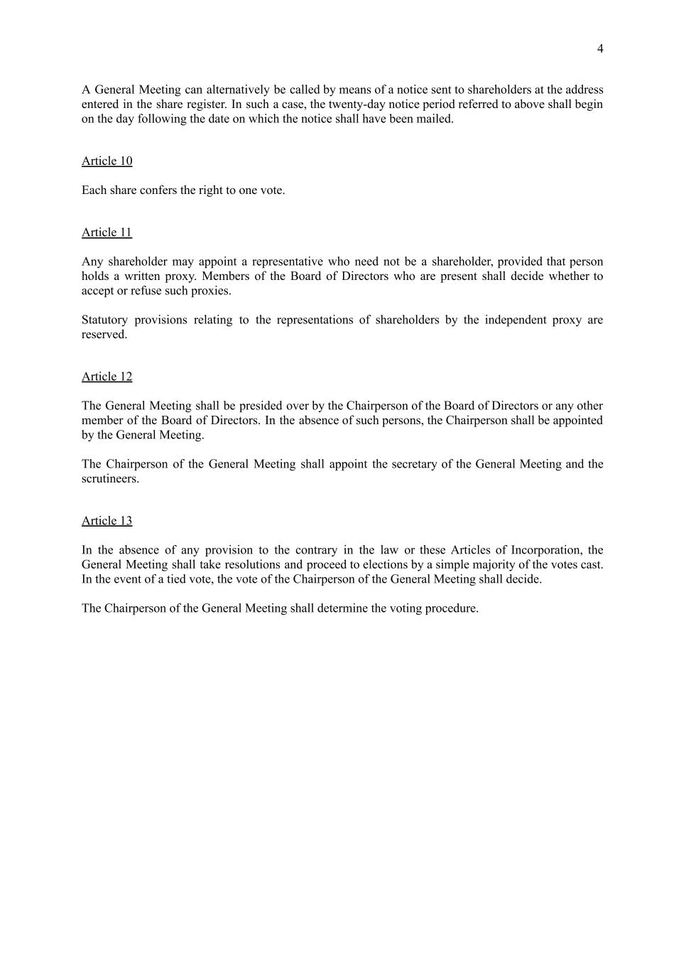 4 A General Meeting can alternatively be called by means of a notice sent to shareholders at the address entered in the share register. In such a case, the twenty-day notice period referred to above shall begin on the day following the date on which the notice shall have been mailed. Article 10 Each share confers the right to one vote. Article 11 Any shareholder may appoint a representative who need not be a shareholder, provided that person holds a written proxy. Members of the Board of Directors who are present shall decide whether to accept or refuse such proxies. Statutory provisions relating to the representations of shareholders by the independent proxy are reserved. Article 12 The General Meeting shall be presided over by the Chairperson of the Board of Directors or any other member of the Board of Directors. In the absence of such persons, the Chairperson shall be appointed by the General Meeting. The Chairperson of the General Meeting shall appoint the secretary of the General Meeting and the scrutineers. Article 13 In the absence of any provision to the contrary in the law or these Articles of Incorporation, the General Meeting shall take resolutions and proceed to elections by a simple majority of the votes cast. In the event of a tied vote, the vote of the Chairperson of the General Meeting shall decide. The Chairperson of the General Meeting shall determine the voting procedure.
