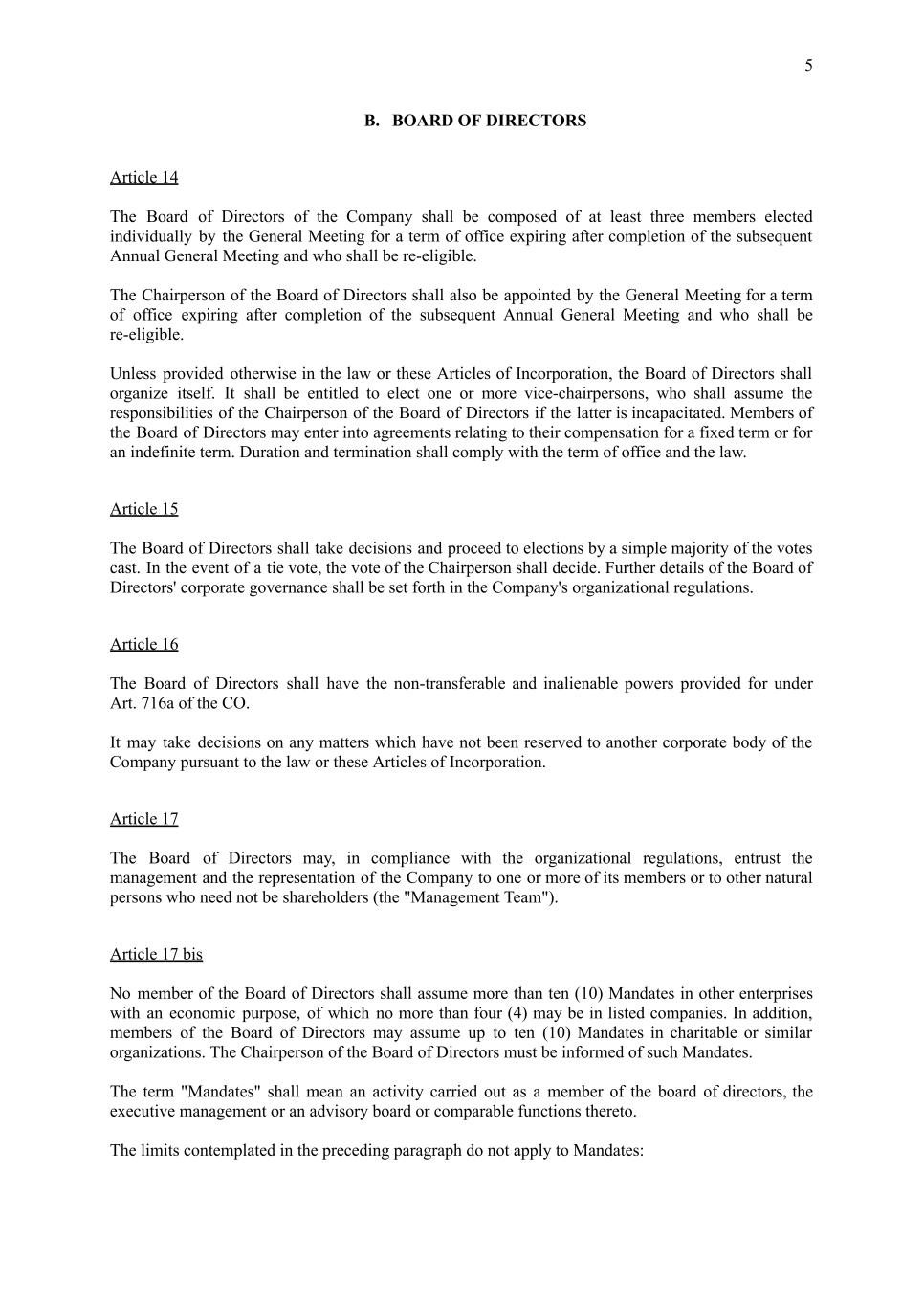 5 B. BOARD OF DIRECTORS Article 14 The Board of Directors of the Company shall be composed of at least three members elected individually by the General Meeting for a term of office expiring after completion of the subsequent Annual General Meeting and who shall be re-eligible. The Chairperson of the Board of Directors shall also be appointed by the General Meeting for a term of office expiring after completion of the subsequent Annual General Meeting and who shall be re-eligible. Unless provided otherwise in the law or these Articles of Incorporation, the Board of Directors shall organize itself. It shall be entitled to elect one or more vice-chairpersons, who shall assume the responsibilities of the Chairperson of the Board of Directors if the latter is incapacitated. Members of the Board of Directors may enter into agreements relating to their compensation for a fixed term or for an indefinite term. Duration and termination shall comply with the term of office and the law. Article 15 The Board of Directors shall take decisions and proceed to elections by a simple majority of the votes cast. In the event of a tie vote, the vote of the Chairperson shall decide. Further details of the Board of Directors' corporate governance shall be set forth in the Company's organizational regulations. Article 16 The Board of Directors shall have the non-transferable and inalienable powers provided for under Art. 716a of the CO. It may take decisions on any matters which have not been reserved to another corporate body of the Company pursuant to the law or these Articles of Incorporation. Article 17 The Board of Directors may, in compliance with the organizational regulations, entrust the management and the representation of the Company to one or more of its members or to other natural persons who need not be shareholders (the "Management Team"). Article 17 bis No member of the Board of Directors shall assume more than ten (10) Mandates in other enterprises with an economic purpose, of which no more than four (4) may be in listed companies. In addition, members of the Board of Directors may assume up to ten (10) Mandates in charitable or similar organizations. The Chairperson of the Board of Directors must be informed of such Mandates. The term "Mandates" shall mean an activity carried out as a member of the board of directors, the executive management or an advisory board or comparable functions thereto. The limits contemplated in the preceding paragraph do not apply to Mandates: