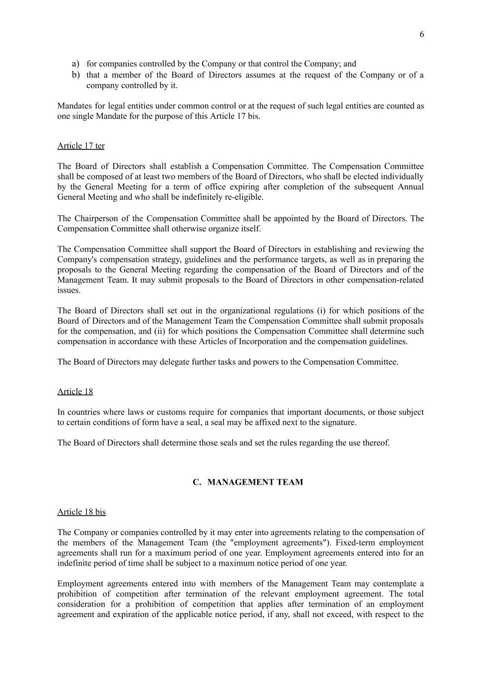 6 a) for companies controlled by the Company or that control the Company; and b) that a member of the Board of Directors assumes at the request of the Company or of a company controlled by it. Mandates for legal entities under common control or at the request of such legal entities are counted as one single Mandate for the purpose of this Article 17 bis. Article 17 ter The Board of Directors shall establish a Compensation Committee. The Compensation Committee shall be composed of at least two members of the Board of Directors, who shall be elected individually by the General Meeting for a term of office expiring after completion of the subsequent Annual General Meeting and who shall be indefinitely re-eligible. The Chairperson of the Compensation Committee shall be appointed by the Board of Directors. The Compensation Committee shall otherwise organize itself. The Compensation Committee shall support the Board of Directors in establishing and reviewing the Company's compensation strategy, guidelines and the performance targets, as well as in preparing the proposals to the General Meeting regarding the compensation of the Board of Directors and of the Management Team. It may submit proposals to the Board of Directors in other compensation-related issues. The Board of Directors shall set out in the organizational regulations (i) for which positions of the Board of Directors and of the Management Team the Compensation Committee shall submit proposals for the compensation, and (ii) for which positions the Compensation Committee shall determine such compensation in accordance with these Articles of Incorporation and the compensation guidelines. The Board of Directors may delegate further tasks and powers to the Compensation Committee. Article 18 In countries where laws or customs require for companies that important documents, or those subject to certain conditions of form have a seal, a seal may be affixed next to the signature. The Board of Directors shall determine those seals and set the rules regarding the use thereof. C. MANAGEMENT TEAM Article 18 bis The Company or companies controlled by it may enter into agreements relating to the compensation of the members of the Management Team (the "employment agreements"). Fixed-term employment agreements shall run for a maximum period of one year. Employment agreements entered into for an indefinite period of time shall be subject to a maximum notice period of one year. Employment agreements entered into with members of the Management Team may contemplate a prohibition of competition after termination of the relevant employment agreement. The total consideration for a prohibition of competition that applies after termination of an employment agreement and expiration of the applicable notice period, if any, shall not exceed, with respect to the