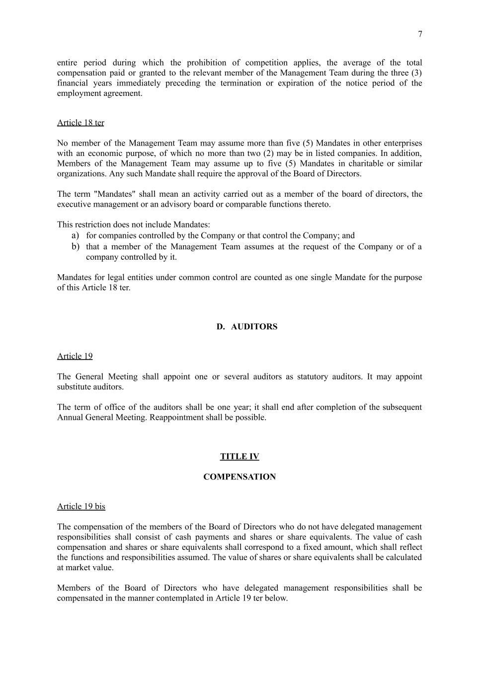 7 entire period during which the prohibition of competition applies, the average of the total compensation paid or granted to the relevant member of the Management Team during the three (3) financial years immediately preceding the termination or expiration of the notice period of the employment agreement. Article 18 ter No member of the Management Team may assume more than five (5) Mandates in other enterprises with an economic purpose, of which no more than two (2) may be in listed companies. In addition, Members of the Management Team may assume up to five (5) Mandates in charitable or similar organizations. Any such Mandate shall require the approval of the Board of Directors. The term "Mandates" shall mean an activity carried out as a member of the board of directors, the executive management or an advisory board or comparable functions thereto. This restriction does not include Mandates: a) for companies controlled by the Company or that control the Company; and b) that a member of the Management Team assumes at the request of the Company or of a company controlled by it. Mandates for legal entities under common control are counted as one single Mandate for the purpose of this Article 18 ter. D. AUDITORS Article 19 The General Meeting shall appoint one or several auditors as statutory auditors. It may appoint substitute auditors. The term of office of the auditors shall be one year; it shall end after completion of the subsequent Annual General Meeting. Reappointment shall be possible. TITLE IV COMPENSATION Article 19 bis The compensation of the members of the Board of Directors who do not have delegated management responsibilities shall consist of cash payments and shares or share equivalents. The value of cash compensation and shares or share equivalents shall correspond to a fixed amount, which shall reflect the functions and responsibilities assumed. The value of shares or share equivalents shall be calculated at market value. Members of the Board of Directors who have delegated management responsibilities shall be compensated in the manner contemplated in Article 19 ter below.