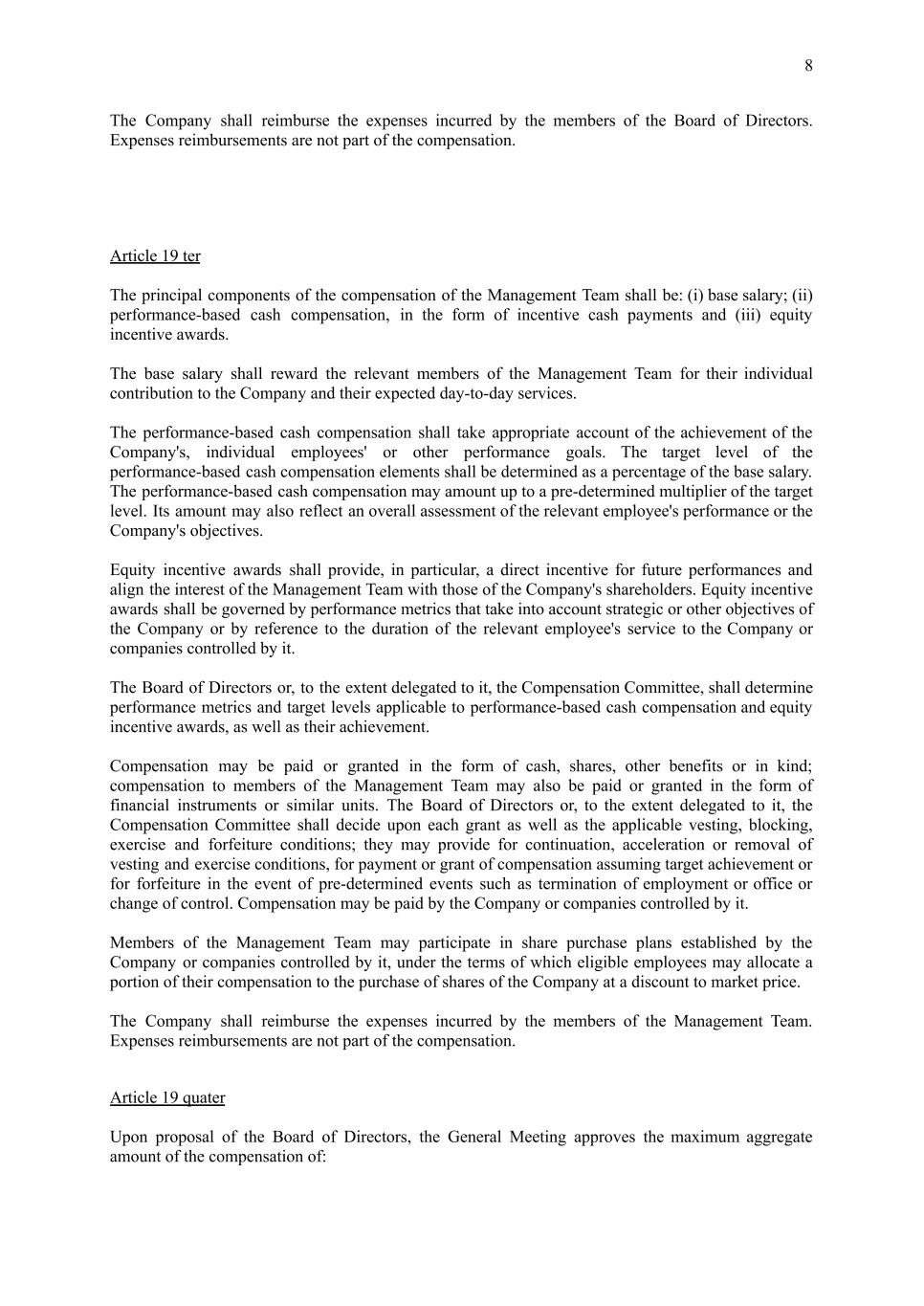 8 The Company shall reimburse the expenses incurred by the members of the Board of Directors. Expenses reimbursements are not part of the compensation. Article 19 ter The principal components of the compensation of the Management Team shall be: (i) base salary; (ii) performance-based cash compensation, in the form of incentive cash payments and (iii) equity incentive awards. The base salary shall reward the relevant members of the Management Team for their individual contribution to the Company and their expected day-to-day services. The performance-based cash compensation shall take appropriate account of the achievement of the Company's, individual employees' or other performance goals. The target level of the performance-based cash compensation elements shall be determined as a percentage of the base salary. The performance-based cash compensation may amount up to a pre-determined multiplier of the target level. Its amount may also reflect an overall assessment of the relevant employee's performance or the Company's objectives. Equity incentive awards shall provide, in particular, a direct incentive for future performances and align the interest of the Management Team with those of the Company's shareholders. Equity incentive awards shall be governed by performance metrics that take into account strategic or other objectives of the Company or by reference to the duration of the relevant employee's service to the Company or companies controlled by it. The Board of Directors or, to the extent delegated to it, the Compensation Committee, shall determine performance metrics and target levels applicable to performance-based cash compensation and equity incentive awards, as well as their achievement. Compensation may be paid or granted in the form of cash, shares, other benefits or in kind; compensation to members of the Management Team may also be paid or granted in the form of financial instruments or similar units. The Board of Directors or, to the extent delegated to it, the Compensation Committee shall decide upon each grant as well as the applicable vesting, blocking, exercise and forfeiture conditions; they may provide for continuation, acceleration or removal of vesting and exercise conditions, for payment or grant of compensation assuming target achievement or for forfeiture in the event of pre-determined events such as termination of employment or office or change of control. Compensation may be paid by the Company or companies controlled by it. Members of the Management Team may participate in share purchase plans established by the Company or companies controlled by it, under the terms of which eligible employees may allocate a portion of their compensation to the purchase of shares of the Company at a discount to market price. The Company shall reimburse the expenses incurred by the members of the Management Team. Expenses reimbursements are not part of the compensation. Article 19 quater Upon proposal of the Board of Directors, the General Meeting approves the maximum aggregate amount of the compensation of: