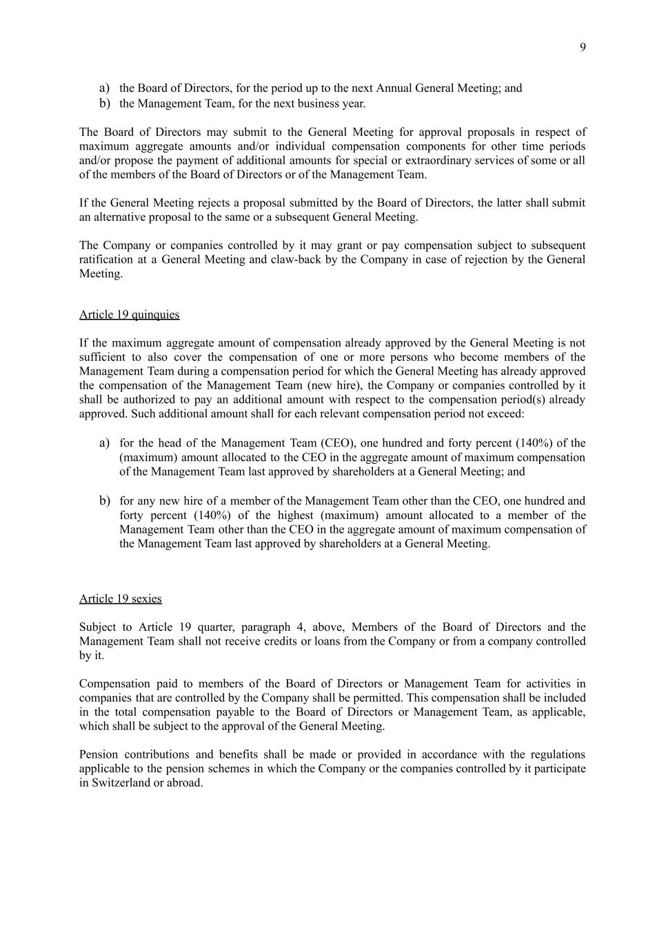 9 a) the Board of Directors, for the period up to the next Annual General Meeting; and b) the Management Team, for the next business year. The Board of Directors may submit to the General Meeting for approval proposals in respect of maximum aggregate amounts and/or individual compensation components for other time periods and/or propose the payment of additional amounts for special or extraordinary services of some or all of the members of the Board of Directors or of the Management Team. If the General Meeting rejects a proposal submitted by the Board of Directors, the latter shall submit an alternative proposal to the same or a subsequent General Meeting. The Company or companies controlled by it may grant or pay compensation subject to subsequent ratification at a General Meeting and claw-back by the Company in case of rejection by the General Meeting. Article 19 quinquies If the maximum aggregate amount of compensation already approved by the General Meeting is not sufficient to also cover the compensation of one or more persons who become members of the Management Team during a compensation period for which the General Meeting has already approved the compensation of the Management Team (new hire), the Company or companies controlled by it shall be authorized to pay an additional amount with respect to the compensation period(s) already approved. Such additional amount shall for each relevant compensation period not exceed: a) for the head of the Management Team (CEO), one hundred and forty percent (140%) of the (maximum) amount allocated to the CEO in the aggregate amount of maximum compensation of the Management Team last approved by shareholders at a General Meeting; and b) for any new hire of a member of the Management Team other than the CEO, one hundred and forty percent (140%) of the highest (maximum) amount allocated to a member of the Management Team other than the CEO in the aggregate amount of maximum compensation of the Management Team last approved by shareholders at a General Meeting. Article 19 sexies Subject to Article 19 quarter, paragraph 4, above, Members of the Board of Directors and the Management Team shall not receive credits or loans from the Company or from a company controlled by it. Compensation paid to members of the Board of Directors or Management Team for activities in companies that are controlled by the Company shall be permitted. This compensation shall be included in the total compensation payable to the Board of Directors or Management Team, as applicable, which shall be subject to the approval of the General Meeting. Pension contributions and benefits shall be made or provided in accordance with the regulations applicable to the pension schemes in which the Company or the companies controlled by it participate in Switzerland or abroad.