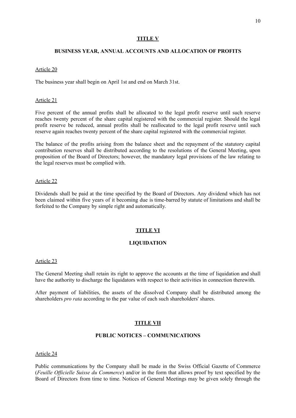 10 TITLE V BUSINESS YEAR, ANNUAL ACCOUNTS AND ALLOCATION OF PROFITS Article 20 The business year shall begin on April 1st and end on March 31st. Article 21 Five percent of the annual profits shall be allocated to the legal profit reserve until such reserve reaches twenty percent of the share capital registered with the commercial register. Should the legal profit reserve be reduced, annual profits shall be reallocated to the legal profit reserve until such reserve again reaches twenty percent of the share capital registered with the commercial register. The balance of the profits arising from the balance sheet and the repayment of the statutory capital contribution reserves shall be distributed according to the resolutions of the General Meeting, upon proposition of the Board of Directors; however, the mandatory legal provisions of the law relating to the legal reserves must be complied with. Article 22 Dividends shall be paid at the time specified by the Board of Directors. Any dividend which has not been claimed within five years of it becoming due is time-barred by statute of limitations and shall be forfeited to the Company by simple right and automatically. TITLE VI LIQUIDATION Article 23 The General Meeting shall retain its right to approve the accounts at the time of liquidation and shall have the authority to discharge the liquidators with respect to their activities in connection therewith. After payment of liabilities, the assets of the dissolved Company shall be distributed among the shareholders pro rata according to the par value of each such shareholders' shares. TITLE VII PUBLIC NOTICES – COMMUNICATIONS Article 24 Public communications by the Company shall be made in the Swiss Official Gazette of Commerce (Feuille Officielle Suisse du Commerce) and/or in the form that allows proof by text specified by the Board of Directors from time to time. Notices of General Meetings may be given solely through the