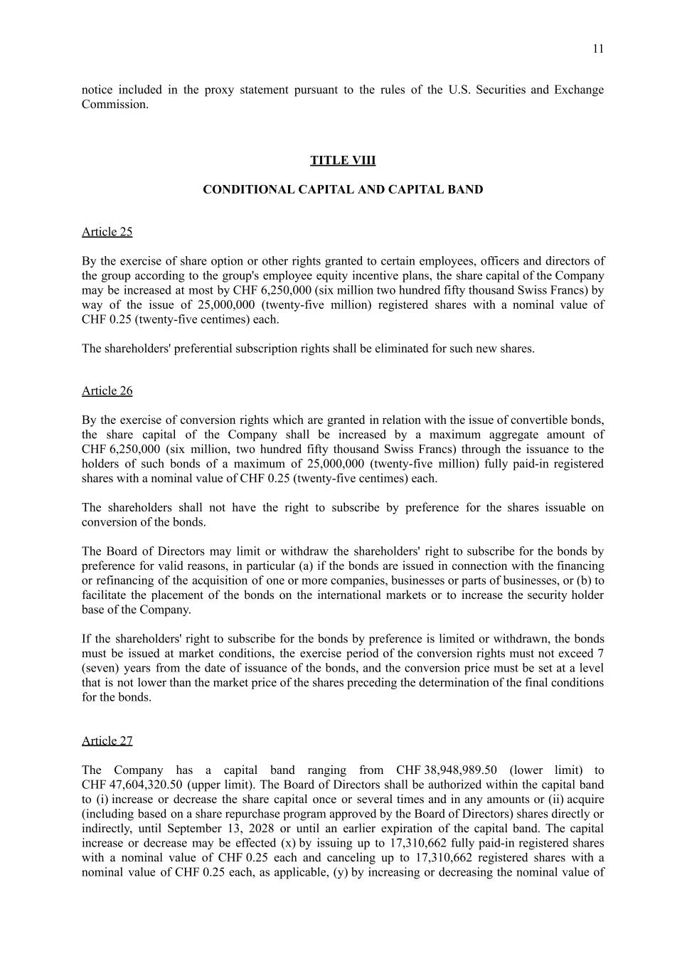 11 notice included in the proxy statement pursuant to the rules of the U.S. Securities and Exchange Commission. TITLE VIII CONDITIONAL CAPITAL AND CAPITAL BAND Article 25 By the exercise of share option or other rights granted to certain employees, officers and directors of the group according to the group's employee equity incentive plans, the share capital of the Company may be increased at most by CHF 6,250,000 (six million two hundred fifty thousand Swiss Francs) by way of the issue of 25,000,000 (twenty-five million) registered shares with a nominal value of CHF 0.25 (twenty-five centimes) each. The shareholders' preferential subscription rights shall be eliminated for such new shares. Article 26 By the exercise of conversion rights which are granted in relation with the issue of convertible bonds, the share capital of the Company shall be increased by a maximum aggregate amount of CHF 6,250,000 (six million, two hundred fifty thousand Swiss Francs) through the issuance to the holders of such bonds of a maximum of 25,000,000 (twenty-five million) fully paid-in registered shares with a nominal value of CHF 0.25 (twenty-five centimes) each. The shareholders shall not have the right to subscribe by preference for the shares issuable on conversion of the bonds. The Board of Directors may limit or withdraw the shareholders' right to subscribe for the bonds by preference for valid reasons, in particular (a) if the bonds are issued in connection with the financing or refinancing of the acquisition of one or more companies, businesses or parts of businesses, or (b) to facilitate the placement of the bonds on the international markets or to increase the security holder base of the Company. If the shareholders' right to subscribe for the bonds by preference is limited or withdrawn, the bonds must be issued at market conditions, the exercise period of the conversion rights must not exceed 7 (seven) years from the date of issuance of the bonds, and the conversion price must be set at a level that is not lower than the market price of the shares preceding the determination of the final conditions for the bonds. Article 27 The Company has a capital band ranging from CHF 38,948,989.50 (lower limit) to CHF 47,604,320.50 (upper limit). The Board of Directors shall be authorized within the capital band to (i) increase or decrease the share capital once or several times and in any amounts or (ii) acquire (including based on a share repurchase program approved by the Board of Directors) shares directly or indirectly, until September 13, 2028 or until an earlier expiration of the capital band. The capital increase or decrease may be effected (x) by issuing up to 17,310,662 fully paid-in registered shares with a nominal value of CHF 0.25 each and canceling up to 17,310,662 registered shares with a nominal value of CHF 0.25 each, as applicable, (y) by increasing or decreasing the nominal value of