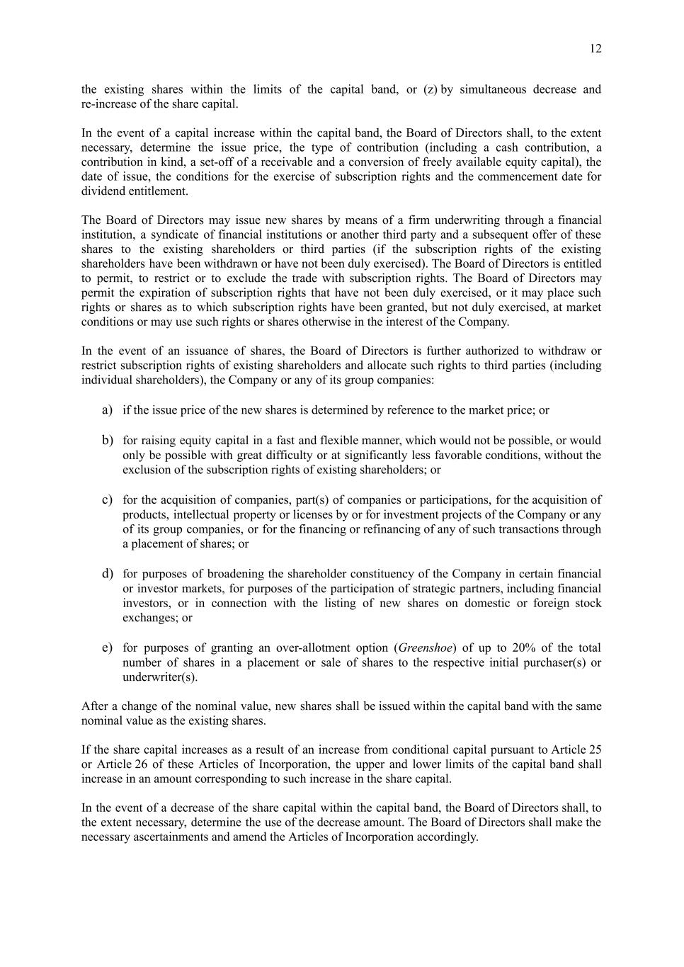 12 the existing shares within the limits of the capital band, or (z) by simultaneous decrease and re-increase of the share capital. In the event of a capital increase within the capital band, the Board of Directors shall, to the extent necessary, determine the issue price, the type of contribution (including a cash contribution, a contribution in kind, a set-off of a receivable and a conversion of freely available equity capital), the date of issue, the conditions for the exercise of subscription rights and the commencement date for dividend entitlement. The Board of Directors may issue new shares by means of a firm underwriting through a financial institution, a syndicate of financial institutions or another third party and a subsequent offer of these shares to the existing shareholders or third parties (if the subscription rights of the existing shareholders have been withdrawn or have not been duly exercised). The Board of Directors is entitled to permit, to restrict or to exclude the trade with subscription rights. The Board of Directors may permit the expiration of subscription rights that have not been duly exercised, or it may place such rights or shares as to which subscription rights have been granted, but not duly exercised, at market conditions or may use such rights or shares otherwise in the interest of the Company. In the event of an issuance of shares, the Board of Directors is further authorized to withdraw or restrict subscription rights of existing shareholders and allocate such rights to third parties (including individual shareholders), the Company or any of its group companies: a) if the issue price of the new shares is determined by reference to the market price; or b) for raising equity capital in a fast and flexible manner, which would not be possible, or would only be possible with great difficulty or at significantly less favorable conditions, without the exclusion of the subscription rights of existing shareholders; or c) for the acquisition of companies, part(s) of companies or participations, for the acquisition of products, intellectual property or licenses by or for investment projects of the Company or any of its group companies, or for the financing or refinancing of any of such transactions through a placement of shares; or d) for purposes of broadening the shareholder constituency of the Company in certain financial or investor markets, for purposes of the participation of strategic partners, including financial investors, or in connection with the listing of new shares on domestic or foreign stock exchanges; or e) for purposes of granting an over-allotment option (Greenshoe) of up to 20% of the total number of shares in a placement or sale of shares to the respective initial purchaser(s) or underwriter(s). After a change of the nominal value, new shares shall be issued within the capital band with the same nominal value as the existing shares. If the share capital increases as a result of an increase from conditional capital pursuant to Article 25 or Article 26 of these Articles of Incorporation, the upper and lower limits of the capital band shall increase in an amount corresponding to such increase in the share capital. In the event of a decrease of the share capital within the capital band, the Board of Directors shall, to the extent necessary, determine the use of the decrease amount. The Board of Directors shall make the necessary ascertainments and amend the Articles of Incorporation accordingly.