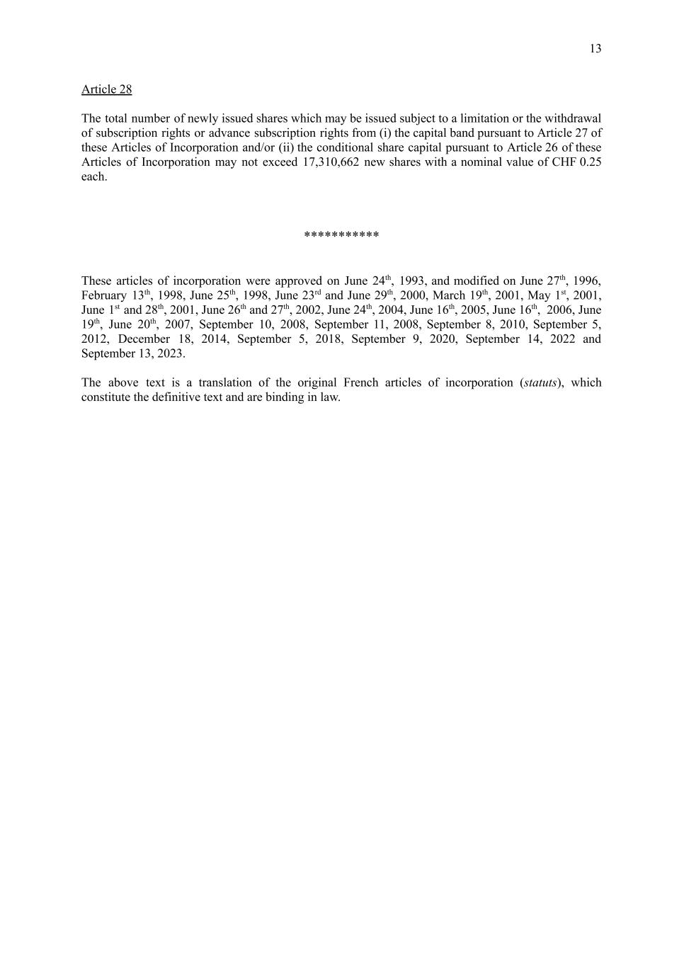 13 Article 28 The total number of newly issued shares which may be issued subject to a limitation or the withdrawal of subscription rights or advance subscription rights from (i) the capital band pursuant to Article 27 of these Articles of Incorporation and/or (ii) the conditional share capital pursuant to Article 26 of these Articles of Incorporation may not exceed 17,310,662 new shares with a nominal value of CHF 0.25 each. *********** These articles of incorporation were approved on June 24th, 1993, and modified on June 27th, 1996, February 13th, 1998, June 25th, 1998, June 23rd and June 29th, 2000, March 19th, 2001, May 1st, 2001, June 1st and 28th, 2001, June 26th and 27th, 2002, June 24th, 2004, June 16th, 2005, June 16th, 2006, June 19th, June 20th, 2007, September 10, 2008, September 11, 2008, September 8, 2010, September 5, 2012, December 18, 2014, September 5, 2018, September 9, 2020, September 14, 2022 and September 13, 2023. The above text is a translation of the original French articles of incorporation (statuts), which constitute the definitive text and are binding in law.