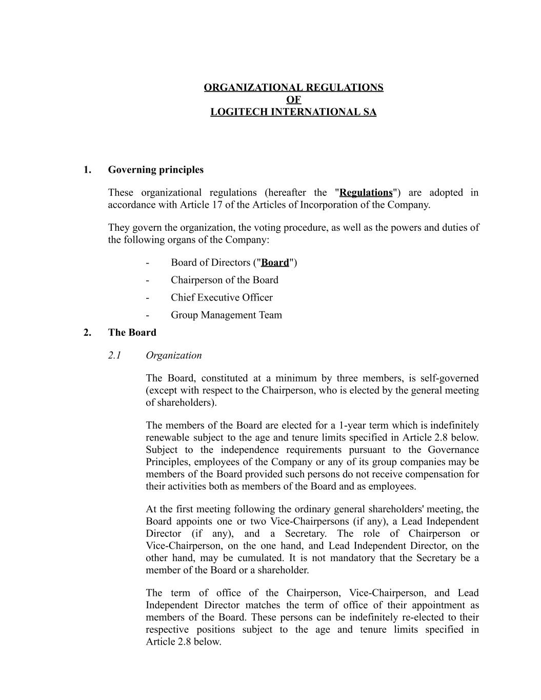 ORGANIZATIONAL REGULATIONS OF LOGITECH INTERNATIONAL SA 1. Governing principles These organizational regulations (hereafter the "Regulations") are adopted in accordance with Article 17 of the Articles of Incorporation of the Company. They govern the organization, the voting procedure, as well as the powers and duties of the following organs of the Company: - Board of Directors ("Board") - Chairperson of the Board - Chief Executive Officer - Group Management Team 2. The Board 2.1 Organization The Board, constituted at a minimum by three members, is self-governed (except with respect to the Chairperson, who is elected by the general meeting of shareholders). The members of the Board are elected for a 1-year term which is indefinitely renewable subject to the age and tenure limits specified in Article 2.8 below. Subject to the independence requirements pursuant to the Governance Principles, employees of the Company or any of its group companies may be members of the Board provided such persons do not receive compensation for their activities both as members of the Board and as employees. At the first meeting following the ordinary general shareholders' meeting, the Board appoints one or two Vice-Chairpersons (if any), a Lead Independent Director (if any), and a Secretary. The role of Chairperson or Vice-Chairperson, on the one hand, and Lead Independent Director, on the other hand, may be cumulated. It is not mandatory that the Secretary be a member of the Board or a shareholder. The term of office of the Chairperson, Vice-Chairperson, and Lead Independent Director matches the term of office of their appointment as members of the Board. These persons can be indefinitely re-elected to their respective positions subject to the age and tenure limits specified in Article 2.8 below.