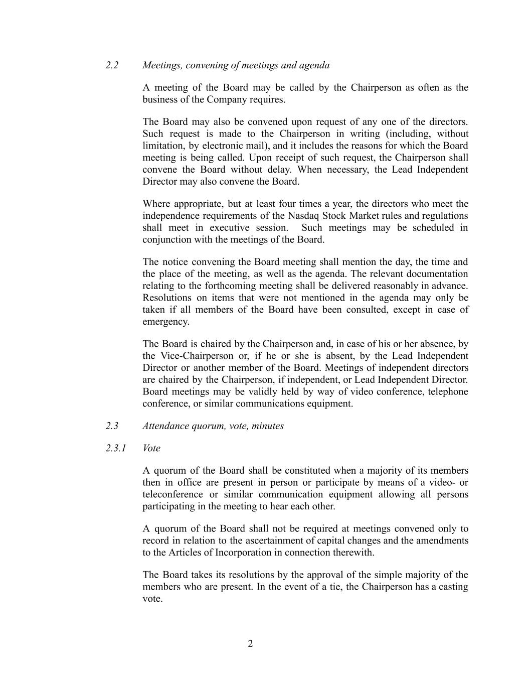 2.2 Meetings, convening of meetings and agenda A meeting of the Board may be called by the Chairperson as often as the business of the Company requires. The Board may also be convened upon request of any one of the directors. Such request is made to the Chairperson in writing (including, without limitation, by electronic mail), and it includes the reasons for which the Board meeting is being called. Upon receipt of such request, the Chairperson shall convene the Board without delay. When necessary, the Lead Independent Director may also convene the Board. Where appropriate, but at least four times a year, the directors who meet the independence requirements of the Nasdaq Stock Market rules and regulations shall meet in executive session. Such meetings may be scheduled in conjunction with the meetings of the Board. The notice convening the Board meeting shall mention the day, the time and the place of the meeting, as well as the agenda. The relevant documentation relating to the forthcoming meeting shall be delivered reasonably in advance. Resolutions on items that were not mentioned in the agenda may only be taken if all members of the Board have been consulted, except in case of emergency. The Board is chaired by the Chairperson and, in case of his or her absence, by the Vice-Chairperson or, if he or she is absent, by the Lead Independent Director or another member of the Board. Meetings of independent directors are chaired by the Chairperson, if independent, or Lead Independent Director. Board meetings may be validly held by way of video conference, telephone conference, or similar communications equipment. 2.3 Attendance quorum, vote, minutes 2.3.1 Vote A quorum of the Board shall be constituted when a majority of its members then in office are present in person or participate by means of a video- or teleconference or similar communication equipment allowing all persons participating in the meeting to hear each other. A quorum of the Board shall not be required at meetings convened only to record in relation to the ascertainment of capital changes and the amendments to the Articles of Incorporation in connection therewith. The Board takes its resolutions by the approval of the simple majority of the members who are present. In the event of a tie, the Chairperson has a casting vote. 2