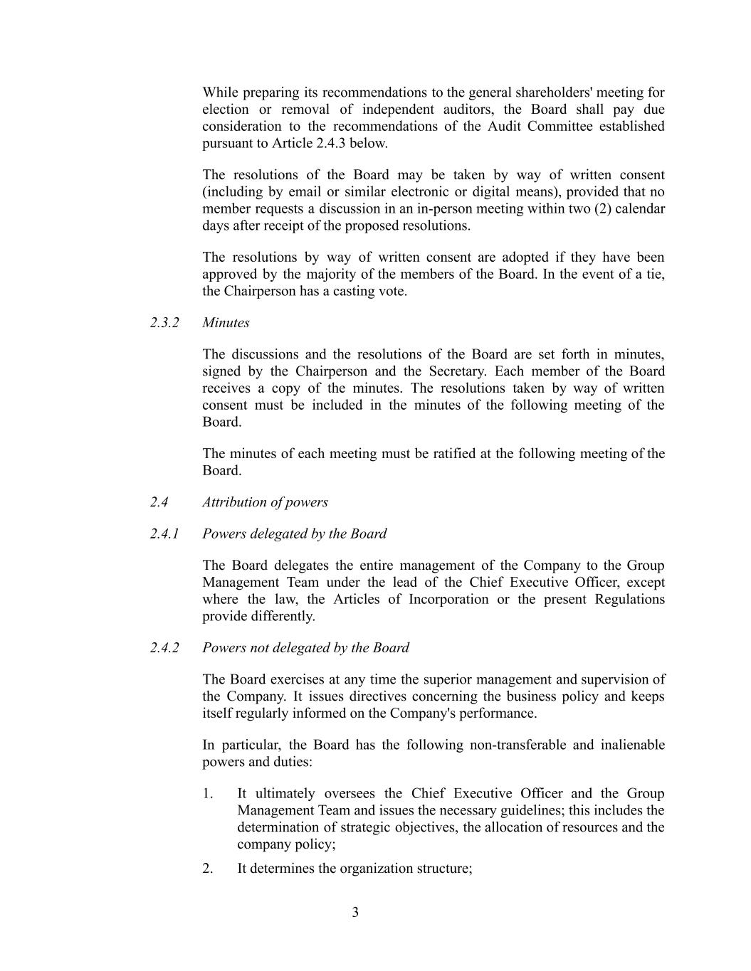 While preparing its recommendations to the general shareholders' meeting for election or removal of independent auditors, the Board shall pay due consideration to the recommendations of the Audit Committee established pursuant to Article 2.4.3 below. The resolutions of the Board may be taken by way of written consent (including by email or similar electronic or digital means), provided that no member requests a discussion in an in-person meeting within two (2) calendar days after receipt of the proposed resolutions. The resolutions by way of written consent are adopted if they have been approved by the majority of the members of the Board. In the event of a tie, the Chairperson has a casting vote. 2.3.2 Minutes The discussions and the resolutions of the Board are set forth in minutes, signed by the Chairperson and the Secretary. Each member of the Board receives a copy of the minutes. The resolutions taken by way of written consent must be included in the minutes of the following meeting of the Board. The minutes of each meeting must be ratified at the following meeting of the Board. 2.4 Attribution of powers 2.4.1 Powers delegated by the Board The Board delegates the entire management of the Company to the Group Management Team under the lead of the Chief Executive Officer, except where the law, the Articles of Incorporation or the present Regulations provide differently. 2.4.2 Powers not delegated by the Board The Board exercises at any time the superior management and supervision of the Company. It issues directives concerning the business policy and keeps itself regularly informed on the Company's performance. In particular, the Board has the following non-transferable and inalienable powers and duties: 1. It ultimately oversees the Chief Executive Officer and the Group Management Team and issues the necessary guidelines; this includes the determination of strategic objectives, the allocation of resources and the company policy; 2. It determines the organization structure; 3