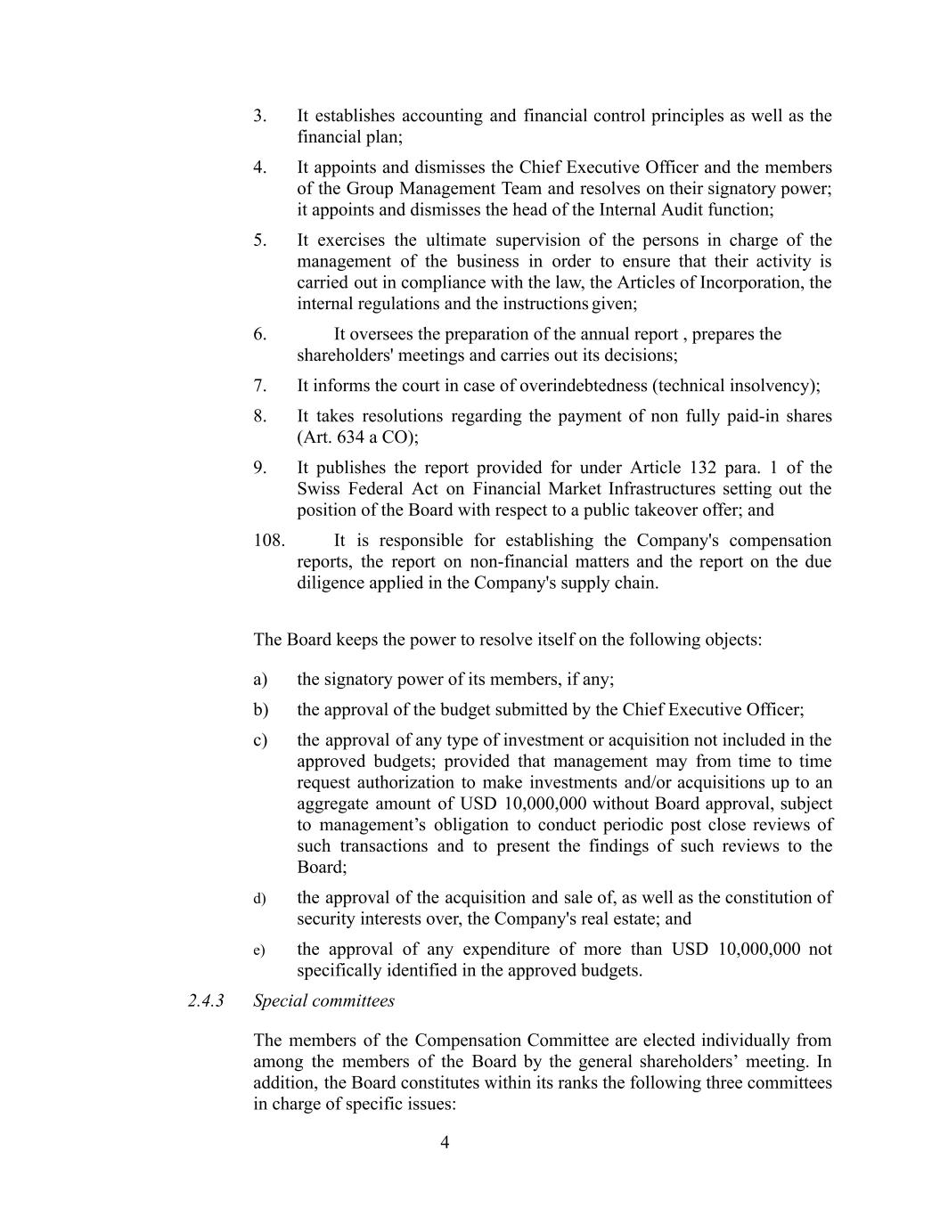 3. It establishes accounting and financial control principles as well as the financial plan; 4. It appoints and dismisses the Chief Executive Officer and the members of the Group Management Team and resolves on their signatory power; it appoints and dismisses the head of the Internal Audit function; 5. It exercises the ultimate supervision of the persons in charge of the management of the business in order to ensure that their activity is carried out in compliance with the law, the Articles of Incorporation, the internal regulations and the instructions given; 6. It oversees the preparation of the annual report , prepares the shareholders' meetings and carries out its decisions; 7. It informs the court in case of overindebtedness (technical insolvency); 8. It takes resolutions regarding the payment of non fully paid-in shares (Art. 634 a CO); 9. It publishes the report provided for under Article 132 para. 1 of the Swiss Federal Act on Financial Market Infrastructures setting out the position of the Board with respect to a public takeover offer; and 108. It is responsible for establishing the Company's compensation reports, the report on non-financial matters and the report on the due diligence applied in the Company's supply chain. The Board keeps the power to resolve itself on the following objects: a) the signatory power of its members, if any; b) the approval of the budget submitted by the Chief Executive Officer; c) the approval of any type of investment or acquisition not included in the approved budgets; provided that management may from time to time request authorization to make investments and/or acquisitions up to an aggregate amount of USD 10,000,000 without Board approval, subject to management’s obligation to conduct periodic post close reviews of such transactions and to present the findings of such reviews to the Board; d) the approval of the acquisition and sale of, as well as the constitution of security interests over, the Company's real estate; and e) the approval of any expenditure of more than USD 10,000,000 not specifically identified in the approved budgets. 2.4.3 Special committees The members of the Compensation Committee are elected individually from among the members of the Board by the general shareholders’ meeting. In addition, the Board constitutes within its ranks the following three committees in charge of specific issues: 4