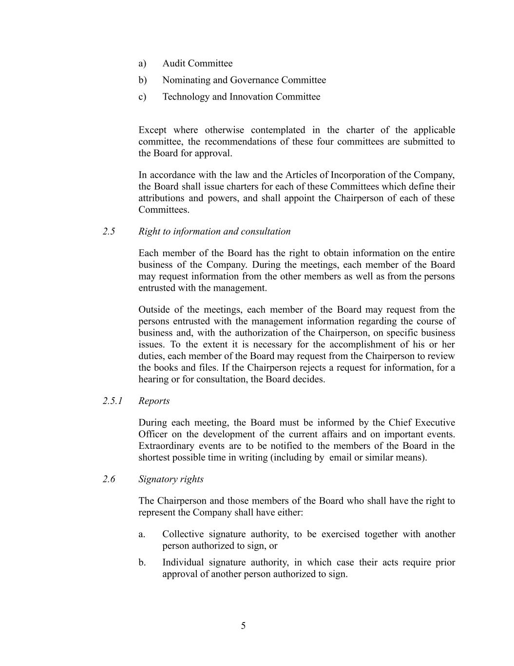 a) Audit Committee b) Nominating and Governance Committee c) Technology and Innovation Committee Except where otherwise contemplated in the charter of the applicable committee, the recommendations of these four committees are submitted to the Board for approval. In accordance with the law and the Articles of Incorporation of the Company, the Board shall issue charters for each of these Committees which define their attributions and powers, and shall appoint the Chairperson of each of these Committees. 2.5 Right to information and consultation Each member of the Board has the right to obtain information on the entire business of the Company. During the meetings, each member of the Board may request information from the other members as well as from the persons entrusted with the management. Outside of the meetings, each member of the Board may request from the persons entrusted with the management information regarding the course of business and, with the authorization of the Chairperson, on specific business issues. To the extent it is necessary for the accomplishment of his or her duties, each member of the Board may request from the Chairperson to review the books and files. If the Chairperson rejects a request for information, for a hearing or for consultation, the Board decides. 2.5.1 Reports During each meeting, the Board must be informed by the Chief Executive Officer on the development of the current affairs and on important events. Extraordinary events are to be notified to the members of the Board in the shortest possible time in writing (including by email or similar means). 2.6 Signatory rights The Chairperson and those members of the Board who shall have the right to represent the Company shall have either: a. Collective signature authority, to be exercised together with another person authorized to sign, or b. Individual signature authority, in which case their acts require prior approval of another person authorized to sign. 5