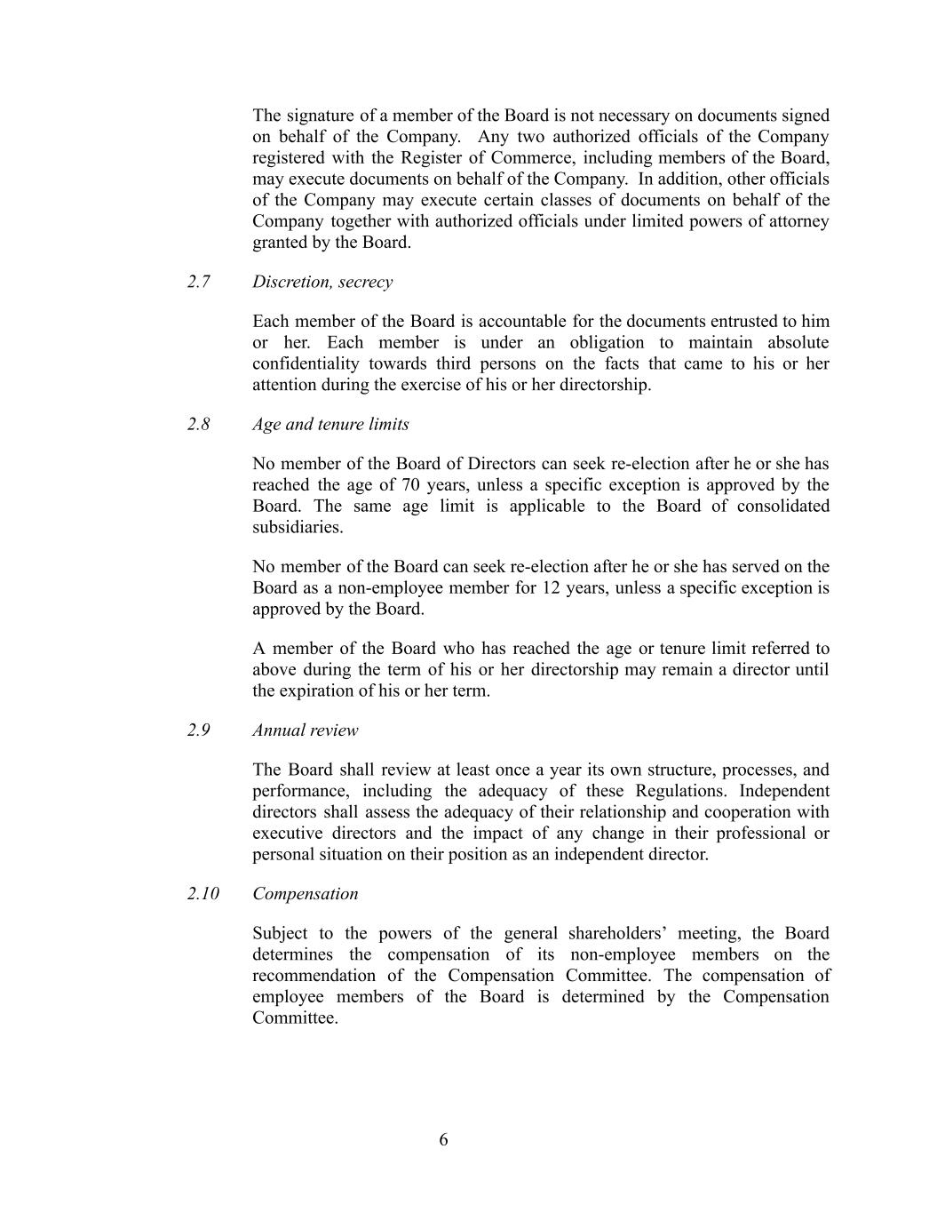 The signature of a member of the Board is not necessary on documents signed on behalf of the Company. Any two authorized officials of the Company registered with the Register of Commerce, including members of the Board, may execute documents on behalf of the Company. In addition, other officials of the Company may execute certain classes of documents on behalf of the Company together with authorized officials under limited powers of attorney granted by the Board. 2.7 Discretion, secrecy Each member of the Board is accountable for the documents entrusted to him or her. Each member is under an obligation to maintain absolute confidentiality towards third persons on the facts that came to his or her attention during the exercise of his or her directorship. 2.8 Age and tenure limits No member of the Board of Directors can seek re-election after he or she has reached the age of 70 years, unless a specific exception is approved by the Board. The same age limit is applicable to the Board of consolidated subsidiaries. No member of the Board can seek re-election after he or she has served on the Board as a non-employee member for 12 years, unless a specific exception is approved by the Board. A member of the Board who has reached the age or tenure limit referred to above during the term of his or her directorship may remain a director until the expiration of his or her term. 2.9 Annual review The Board shall review at least once a year its own structure, processes, and performance, including the adequacy of these Regulations. Independent directors shall assess the adequacy of their relationship and cooperation with executive directors and the impact of any change in their professional or personal situation on their position as an independent director. 2.10 Compensation Subject to the powers of the general shareholders’ meeting, the Board determines the compensation of its non-employee members on the recommendation of the Compensation Committee. The compensation of employee members of the Board is determined by the Compensation Committee. 6