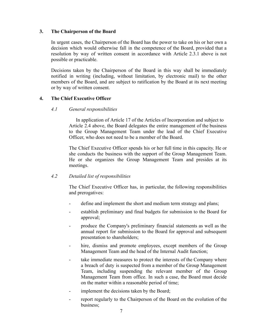 3. The Chairperson of the Board In urgent cases, the Chairperson of the Board has the power to take on his or her own a decision which would otherwise fall in the competence of the Board, provided that a resolution by way of written consent in accordance with Article 2.3.1 above is not possible or practicable. Decisions taken by the Chairperson of the Board in this way shall be immediately notified in writing (including, without limitation, by electronic mail) to the other members of the Board, and are subject to ratification by the Board at its next meeting or by way of written consent. 4. The Chief Executive Officer 4.1 General responsibilities In application of Article 17 of the Articles of Incorporation and subject to Article 2.4 above, the Board delegates the entire management of the business to the Group Management Team under the lead of the Chief Executive Officer, who does not need to be a member of the Board. The Chief Executive Officer spends his or her full time in this capacity. He or she conducts the business with the support of the Group Management Team. He or she organizes the Group Management Team and presides at its meetings. 4.2 Detailed list of responsibilities The Chief Executive Officer has, in particular, the following responsibilities and prerogatives: - define and implement the short and medium term strategy and plans; - establish preliminary and final budgets for submission to the Board for approval; - produce the Company's preliminary financial statements as well as the annual report for submission to the Board for approval and subsequent presentation to shareholders; - hire, dismiss and promote employees, except members of the Group Management Team and the head of the Internal Audit function; - take immediate measures to protect the interests of the Company where a breach of duty is suspected from a member of the Group Management Team, including suspending the relevant member of the Group Management Team from office. In such a case, the Board must decide on the matter within a reasonable period of time; - implement the decisions taken by the Board; - report regularly to the Chairperson of the Board on the evolution of the business; 7