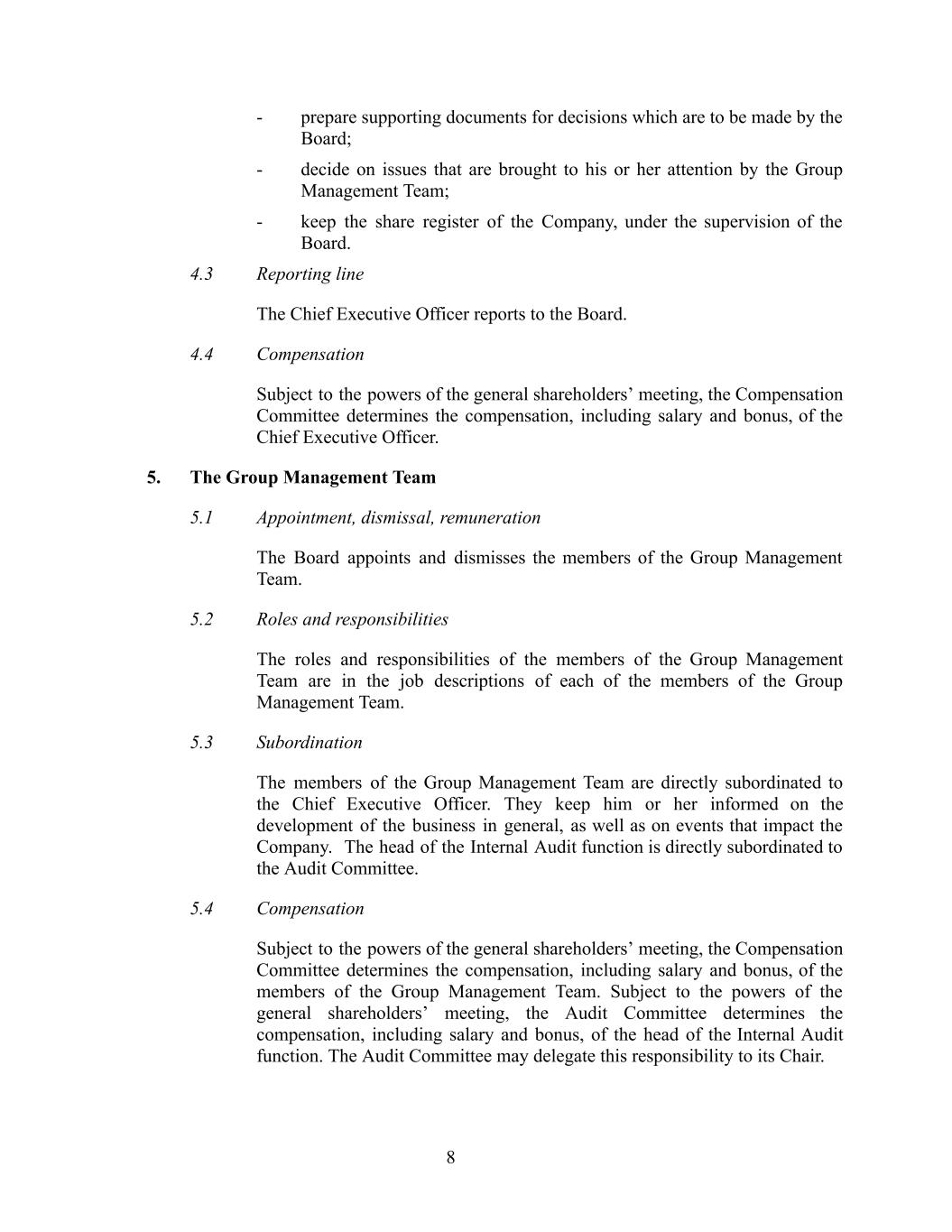 - prepare supporting documents for decisions which are to be made by the Board; - decide on issues that are brought to his or her attention by the Group Management Team; - keep the share register of the Company, under the supervision of the Board. 4.3 Reporting line The Chief Executive Officer reports to the Board. 4.4 Compensation Subject to the powers of the general shareholders’ meeting, the Compensation Committee determines the compensation, including salary and bonus, of the Chief Executive Officer. 5. The Group Management Team 5.1 Appointment, dismissal, remuneration The Board appoints and dismisses the members of the Group Management Team. 5.2 Roles and responsibilities The roles and responsibilities of the members of the Group Management Team are in the job descriptions of each of the members of the Group Management Team. 5.3 Subordination The members of the Group Management Team are directly subordinated to the Chief Executive Officer. They keep him or her informed on the development of the business in general, as well as on events that impact the Company. The head of the Internal Audit function is directly subordinated to the Audit Committee. 5.4 Compensation Subject to the powers of the general shareholders’ meeting, the Compensation Committee determines the compensation, including salary and bonus, of the members of the Group Management Team. Subject to the powers of the general shareholders’ meeting, the Audit Committee determines the compensation, including salary and bonus, of the head of the Internal Audit function. The Audit Committee may delegate this responsibility to its Chair. 8
