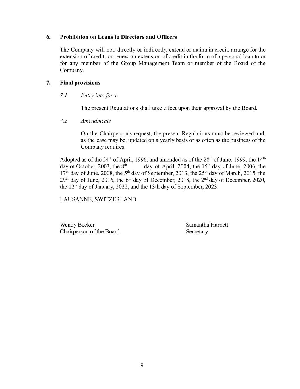 6. Prohibition on Loans to Directors and Officers The Company will not, directly or indirectly, extend or maintain credit, arrange for the extension of credit, or renew an extension of credit in the form of a personal loan to or for any member of the Group Management Team or member of the Board of the Company. 7. Final provisions 7.1 Entry into force The present Regulations shall take effect upon their approval by the Board. 7.2 Amendments On the Chairperson's request, the present Regulations must be reviewed and, as the case may be, updated on a yearly basis or as often as the business of the Company requires. Adopted as of the 24th of April, 1996, and amended as of the 28th of June, 1999, the 14th day of October, 2003, the 8th day of April, 2004, the 15th day of June, 2006, the 17th day of June, 2008, the 5th day of September, 2013, the 25th day of March, 2015, the 29th day of June, 2016, the 6th day of December, 2018, the 2nd day of December, 2020, the 12th day of January, 2022, and the 13th day of September, 2023. LAUSANNE, SWITZERLAND Wendy Becker Samantha Harnett Chairperson of the Board Secretary 9