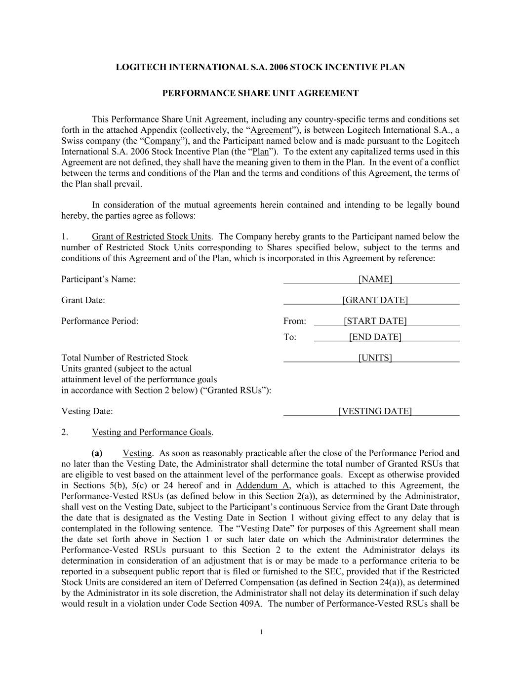 1 LOGITECH INTERNATIONAL S.A. 2006 STOCK INCENTIVE PLAN PERFORMANCE SHARE UNIT AGREEMENT This Performance Share Unit Agreement, including any country-specific terms and conditions set forth in the attached Appendix (collectively, the “Agreement”), is between Logitech International S.A., a Swiss company (the “Company”), and the Participant named below and is made pursuant to the Logitech International S.A. 2006 Stock Incentive Plan (the “Plan”). To the extent any capitalized terms used in this Agreement are not defined, they shall have the meaning given to them in the Plan. In the event of a conflict between the terms and conditions of the Plan and the terms and conditions of this Agreement, the terms of the Plan shall prevail. In consideration of the mutual agreements herein contained and intending to be legally bound hereby, the parties agree as follows: 1. Grant of Restricted Stock Units. The Company hereby grants to the Participant named below the number of Restricted Stock Units corresponding to Shares specified below, subject to the terms and conditions of this Agreement and of the Plan, which is incorporated in this Agreement by reference: Participant’s Name: [NAME] Grant Date: [GRANT DATE] Performance Period: From: [START DATE] To: [END DATE] Total Number of Restricted Stock [UNITS] Units granted (subject to the actual attainment level of the performance goals in accordance with Section 2 below) (“Granted RSUs”): Vesting Date: [VESTING DATE] 2. Vesting and Performance Goals. (a) Vesting. As soon as reasonably practicable after the close of the Performance Period and no later than the Vesting Date, the Administrator shall determine the total number of Granted RSUs that are eligible to vest based on the attainment level of the performance goals. Except as otherwise provided in Sections 5(b), 5(c) or 24 hereof and in Addendum A, which is attached to this Agreement, the Performance-Vested RSUs (as defined below in this Section 2(a)), as determined by the Administrator, shall vest on the Vesting Date, subject to the Participant’s continuous Service from the Grant Date through the date that is designated as the Vesting Date in Section 1 without giving effect to any delay that is contemplated in the following sentence. The “Vesting Date” for purposes of this Agreement shall mean the date set forth above in Section 1 or such later date on which the Administrator determines the Performance-Vested RSUs pursuant to this Section 2 to the extent the Administrator delays its determination in consideration of an adjustment that is or may be made to a performance criteria to be reported in a subsequent public report that is filed or furnished to the SEC, provided that if the Restricted Stock Units are considered an item of Deferred Compensation (as defined in Section 24(a)), as determined by the Administrator in its sole discretion, the Administrator shall not delay its determination if such delay would result in a violation under Code Section 409A. The number of Performance-Vested RSUs shall be