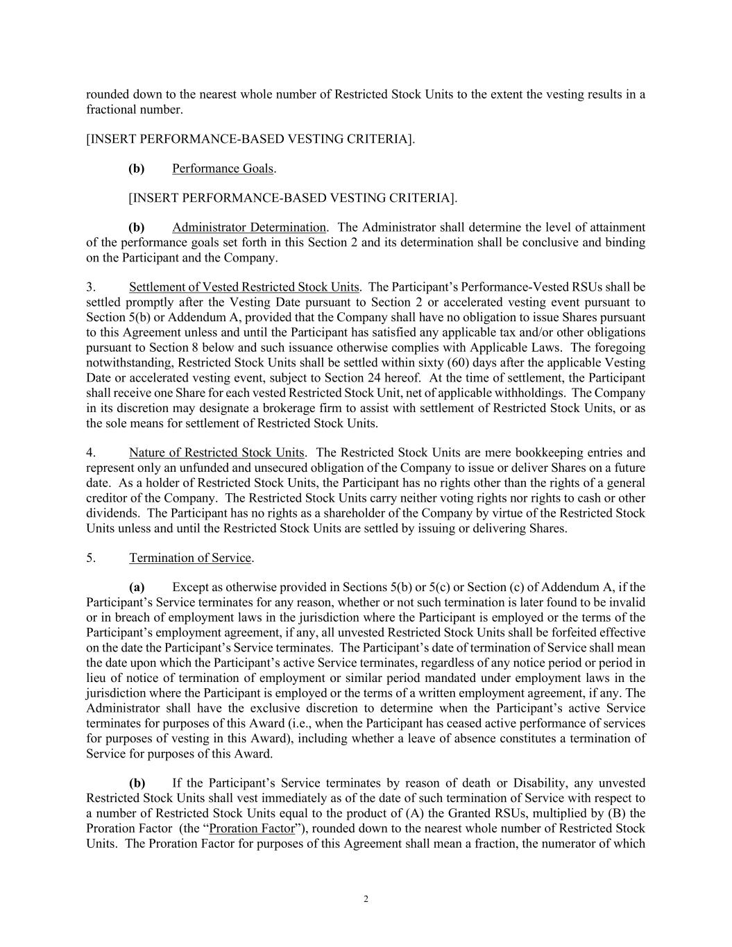 2 rounded down to the nearest whole number of Restricted Stock Units to the extent the vesting results in a fractional number. [INSERT PERFORMANCE-BASED VESTING CRITERIA]. (b) Performance Goals. [INSERT PERFORMANCE-BASED VESTING CRITERIA]. (b) Administrator Determination. The Administrator shall determine the level of attainment of the performance goals set forth in this Section 2 and its determination shall be conclusive and binding on the Participant and the Company. 3. Settlement of Vested Restricted Stock Units. The Participant’s Performance-Vested RSUs shall be settled promptly after the Vesting Date pursuant to Section 2 or accelerated vesting event pursuant to Section 5(b) or Addendum A, provided that the Company shall have no obligation to issue Shares pursuant to this Agreement unless and until the Participant has satisfied any applicable tax and/or other obligations pursuant to Section 8 below and such issuance otherwise complies with Applicable Laws. The foregoing notwithstanding, Restricted Stock Units shall be settled within sixty (60) days after the applicable Vesting Date or accelerated vesting event, subject to Section 24 hereof. At the time of settlement, the Participant shall receive one Share for each vested Restricted Stock Unit, net of applicable withholdings. The Company in its discretion may designate a brokerage firm to assist with settlement of Restricted Stock Units, or as the sole means for settlement of Restricted Stock Units. 4. Nature of Restricted Stock Units. The Restricted Stock Units are mere bookkeeping entries and represent only an unfunded and unsecured obligation of the Company to issue or deliver Shares on a future date. As a holder of Restricted Stock Units, the Participant has no rights other than the rights of a general creditor of the Company. The Restricted Stock Units carry neither voting rights nor rights to cash or other dividends. The Participant has no rights as a shareholder of the Company by virtue of the Restricted Stock Units unless and until the Restricted Stock Units are settled by issuing or delivering Shares. 5. Termination of Service. (a) Except as otherwise provided in Sections 5(b) or 5(c) or Section (c) of Addendum A, if the Participant’s Service terminates for any reason, whether or not such termination is later found to be invalid or in breach of employment laws in the jurisdiction where the Participant is employed or the terms of the Participant’s employment agreement, if any, all unvested Restricted Stock Units shall be forfeited effective on the date the Participant’s Service terminates. The Participant’s date of termination of Service shall mean the date upon which the Participant’s active Service terminates, regardless of any notice period or period in lieu of notice of termination of employment or similar period mandated under employment laws in the jurisdiction where the Participant is employed or the terms of a written employment agreement, if any. The Administrator shall have the exclusive discretion to determine when the Participant’s active Service terminates for purposes of this Award (i.e., when the Participant has ceased active performance of services for purposes of vesting in this Award), including whether a leave of absence constitutes a termination of Service for purposes of this Award. (b) If the Participant’s Service terminates by reason of death or Disability, any unvested Restricted Stock Units shall vest immediately as of the date of such termination of Service with respect to a number of Restricted Stock Units equal to the product of (A) the Granted RSUs, multiplied by (B) the Proration Factor (the “Proration Factor”), rounded down to the nearest whole number of Restricted Stock Units. The Proration Factor for purposes of this Agreement shall mean a fraction, the numerator of which