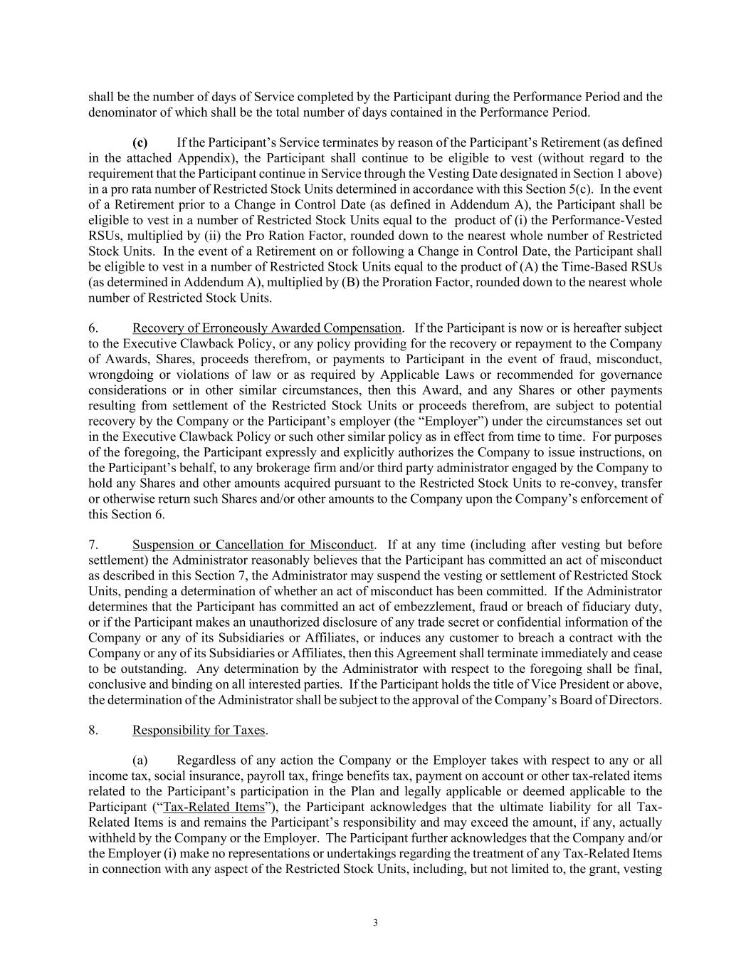 3 shall be the number of days of Service completed by the Participant during the Performance Period and the denominator of which shall be the total number of days contained in the Performance Period. (c) If the Participant’s Service terminates by reason of the Participant’s Retirement (as defined in the attached Appendix), the Participant shall continue to be eligible to vest (without regard to the requirement that the Participant continue in Service through the Vesting Date designated in Section 1 above) in a pro rata number of Restricted Stock Units determined in accordance with this Section 5(c). In the event of a Retirement prior to a Change in Control Date (as defined in Addendum A), the Participant shall be eligible to vest in a number of Restricted Stock Units equal to the product of (i) the Performance-Vested RSUs, multiplied by (ii) the Pro Ration Factor, rounded down to the nearest whole number of Restricted Stock Units. In the event of a Retirement on or following a Change in Control Date, the Participant shall be eligible to vest in a number of Restricted Stock Units equal to the product of (A) the Time-Based RSUs (as determined in Addendum A), multiplied by (B) the Proration Factor, rounded down to the nearest whole number of Restricted Stock Units. 6. Recovery of Erroneously Awarded Compensation. If the Participant is now or is hereafter subject to the Executive Clawback Policy, or any policy providing for the recovery or repayment to the Company of Awards, Shares, proceeds therefrom, or payments to Participant in the event of fraud, misconduct, wrongdoing or violations of law or as required by Applicable Laws or recommended for governance considerations or in other similar circumstances, then this Award, and any Shares or other payments resulting from settlement of the Restricted Stock Units or proceeds therefrom, are subject to potential recovery by the Company or the Participant’s employer (the “Employer”) under the circumstances set out in the Executive Clawback Policy or such other similar policy as in effect from time to time. For purposes of the foregoing, the Participant expressly and explicitly authorizes the Company to issue instructions, on the Participant’s behalf, to any brokerage firm and/or third party administrator engaged by the Company to hold any Shares and other amounts acquired pursuant to the Restricted Stock Units to re-convey, transfer or otherwise return such Shares and/or other amounts to the Company upon the Company’s enforcement of this Section 6. 7. Suspension or Cancellation for Misconduct. If at any time (including after vesting but before settlement) the Administrator reasonably believes that the Participant has committed an act of misconduct as described in this Section 7, the Administrator may suspend the vesting or settlement of Restricted Stock Units, pending a determination of whether an act of misconduct has been committed. If the Administrator determines that the Participant has committed an act of embezzlement, fraud or breach of fiduciary duty, or if the Participant makes an unauthorized disclosure of any trade secret or confidential information of the Company or any of its Subsidiaries or Affiliates, or induces any customer to breach a contract with the Company or any of its Subsidiaries or Affiliates, then this Agreement shall terminate immediately and cease to be outstanding. Any determination by the Administrator with respect to the foregoing shall be final, conclusive and binding on all interested parties. If the Participant holds the title of Vice President or above, the determination of the Administrator shall be subject to the approval of the Company’s Board of Directors. 8. Responsibility for Taxes. (a) Regardless of any action the Company or the Employer takes with respect to any or all income tax, social insurance, payroll tax, fringe benefits tax, payment on account or other tax-related items related to the Participant’s participation in the Plan and legally applicable or deemed applicable to the Participant (“Tax-Related Items”), the Participant acknowledges that the ultimate liability for all Tax- Related Items is and remains the Participant’s responsibility and may exceed the amount, if any, actually withheld by the Company or the Employer. The Participant further acknowledges that the Company and/or the Employer (i) make no representations or undertakings regarding the treatment of any Tax-Related Items in connection with any aspect of the Restricted Stock Units, including, but not limited to, the grant, vesting