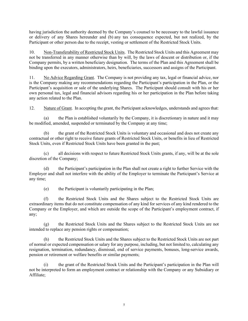 5 having jurisdiction the authority deemed by the Company’s counsel to be necessary to the lawful issuance or delivery of any Shares hereunder and (b) any tax consequence expected, but not realized, by the Participant or other person due to the receipt, vesting or settlement of the Restricted Stock Units. 10. Non-Transferability of Restricted Stock Units. The Restricted Stock Units and this Agreement may not be transferred in any manner otherwise than by will, by the laws of descent or distribution or, if the Company permits, by a written beneficiary designation. The terms of the Plan and this Agreement shall be binding upon the executors, administrators, heirs, beneficiaries, successors and assigns of the Participant. 11. No Advice Regarding Grant. The Company is not providing any tax, legal or financial advice, nor is the Company making any recommendations regarding the Participant’s participation in the Plan, or the Participant’s acquisition or sale of the underlying Shares. The Participant should consult with his or her own personal tax, legal and financial advisors regarding his or her participation in the Plan before taking any action related to the Plan. 12. Nature of Grant. In accepting the grant, the Participant acknowledges, understands and agrees that: (a) the Plan is established voluntarily by the Company, it is discretionary in nature and it may be modified, amended, suspended or terminated by the Company at any time; (b) the grant of the Restricted Stock Units is voluntary and occasional and does not create any contractual or other right to receive future grants of Restricted Stock Units, or benefits in lieu of Restricted Stock Units, even if Restricted Stock Units have been granted in the past; (c) all decisions with respect to future Restricted Stock Units grants, if any, will be at the sole discretion of the Company; (d) the Participant’s participation in the Plan shall not create a right to further Service with the Employer and shall not interfere with the ability of the Employer to terminate the Participant’s Service at any time; (e) the Participant is voluntarily participating in the Plan; (f) the Restricted Stock Units and the Shares subject to the Restricted Stock Units are extraordinary items that do not constitute compensation of any kind for services of any kind rendered to the Company or the Employer, and which are outside the scope of the Participant’s employment contract, if any; (g) the Restricted Stock Units and the Shares subject to the Restricted Stock Units are not intended to replace any pension rights or compensation; (h) the Restricted Stock Units and the Shares subject to the Restricted Stock Units are not part of normal or expected compensation or salary for any purpose, including, but not limited to, calculating any resignation, termination, redundancy, dismissal, end of service payments, bonuses, long-service awards, pension or retirement or welfare benefits or similar payments; (i) the grant of the Restricted Stock Units and the Participant’s participation in the Plan will not be interpreted to form an employment contract or relationship with the Company or any Subsidiary or Affiliate;