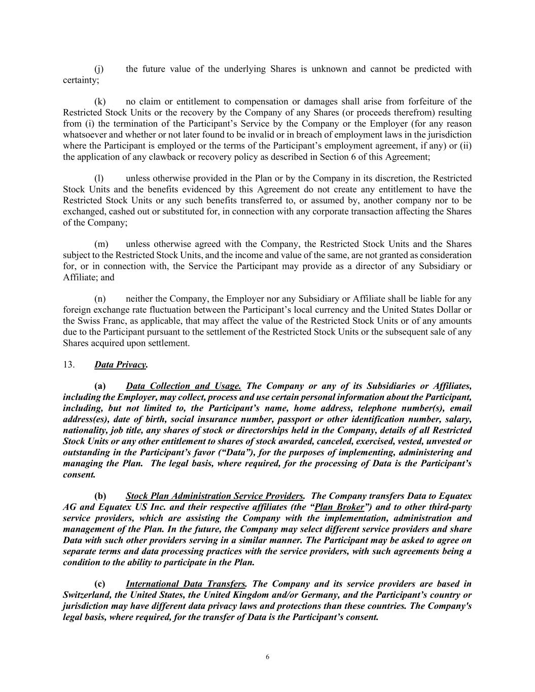 6 (j) the future value of the underlying Shares is unknown and cannot be predicted with certainty; (k) no claim or entitlement to compensation or damages shall arise from forfeiture of the Restricted Stock Units or the recovery by the Company of any Shares (or proceeds therefrom) resulting from (i) the termination of the Participant’s Service by the Company or the Employer (for any reason whatsoever and whether or not later found to be invalid or in breach of employment laws in the jurisdiction where the Participant is employed or the terms of the Participant’s employment agreement, if any) or (ii) the application of any clawback or recovery policy as described in Section 6 of this Agreement; (l) unless otherwise provided in the Plan or by the Company in its discretion, the Restricted Stock Units and the benefits evidenced by this Agreement do not create any entitlement to have the Restricted Stock Units or any such benefits transferred to, or assumed by, another company nor to be exchanged, cashed out or substituted for, in connection with any corporate transaction affecting the Shares of the Company; (m) unless otherwise agreed with the Company, the Restricted Stock Units and the Shares subject to the Restricted Stock Units, and the income and value of the same, are not granted as consideration for, or in connection with, the Service the Participant may provide as a director of any Subsidiary or Affiliate; and (n) neither the Company, the Employer nor any Subsidiary or Affiliate shall be liable for any foreign exchange rate fluctuation between the Participant’s local currency and the United States Dollar or the Swiss Franc, as applicable, that may affect the value of the Restricted Stock Units or of any amounts due to the Participant pursuant to the settlement of the Restricted Stock Units or the subsequent sale of any Shares acquired upon settlement. 13. Data Privacy. (a) Data Collection and Usage. The Company or any of its Subsidiaries or Affiliates, including the Employer, may collect, process and use certain personal information about the Participant, including, but not limited to, the Participant’s name, home address, telephone number(s), email address(es), date of birth, social insurance number, passport or other identification number, salary, nationality, job title, any shares of stock or directorships held in the Company, details of all Restricted Stock Units or any other entitlement to shares of stock awarded, canceled, exercised, vested, unvested or outstanding in the Participant’s favor (“Data”), for the purposes of implementing, administering and managing the Plan. The legal basis, where required, for the processing of Data is the Participant’s consent. (b) Stock Plan Administration Service Providers. The Company transfers Data to Equatex AG and Equatex US Inc. and their respective affiliates (the “Plan Broker”) and to other third-party service providers, which are assisting the Company with the implementation, administration and management of the Plan. In the future, the Company may select different service providers and share Data with such other providers serving in a similar manner. The Participant may be asked to agree on separate terms and data processing practices with the service providers, with such agreements being a condition to the ability to participate in the Plan. (c) International Data Transfers. The Company and its service providers are based in Switzerland, the United States, the United Kingdom and/or Germany, and the Participant’s country or jurisdiction may have different data privacy laws and protections than these countries. The Company's legal basis, where required, for the transfer of Data is the Participant’s consent.