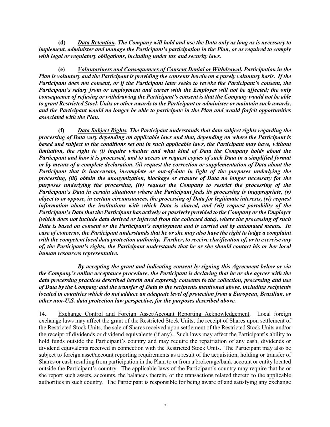 7 (d) Data Retention. The Company will hold and use the Data only as long as is necessary to implement, administer and manage the Participant’s participation in the Plan, or as required to comply with legal or regulatory obligations, including under tax and security laws. (e) Voluntariness and Consequences of Consent Denial or Withdrawal. Participation in the Plan is voluntary and the Participant is providing the consents herein on a purely voluntary basis. If the Participant does not consent, or if the Participant later seeks to revoke the Participant’s consent, the Participant’s salary from or employment and career with the Employer will not be affected; the only consequence of refusing or withdrawing the Participant’s consent is that the Company would not be able to grant Restricted Stock Units or other awards to the Participant or administer or maintain such awards, and the Participant would no longer be able to participate in the Plan and would forfeit opportunities associated with the Plan. (f) Data Subject Rights. The Participant understands that data subject rights regarding the processing of Data vary depending on applicable laws and that, depending on where the Participant is based and subject to the conditions set out in such applicable laws, the Participant may have, without limitation, the right to (i) inquire whether and what kind of Data the Company holds about the Participant and how it is processed, and to access or request copies of such Data in a simplified format or by means of a complete declaration, (ii) request the correction or supplementation of Data about the Participant that is inaccurate, incomplete or out-of-date in light of the purposes underlying the processing, (iii) obtain the anonymization, blockage or erasure of Data no longer necessary for the purposes underlying the processing, (iv) request the Company to restrict the processing of the Participant’s Data in certain situations where the Participant feels its processing is inappropriate, (v) object to or oppose, in certain circumstances, the processing of Data for legitimate interests, (vi) request information about the institutions with which Data is shared, and (vii) request portability of the Participant’s Data that the Participant has actively or passively provided to the Company or the Employer (which does not include data derived or inferred from the collected data), where the processing of such Data is based on consent or the Participant’s employment and is carried out by automated means. In case of concerns, the Participant understands that he or she may also have the right to lodge a complaint with the competent local data protection authority. Further, to receive clarification of, or to exercise any of, the Participant’s rights, the Participant understands that he or she should contact his or her local human resources representative. By accepting the grant and indicating consent by signing this Agreement below or via the Company’s online acceptance procedure, the Participant is declaring that he or she agrees with the data processing practices described herein and expressly consents to the collection, processing and use of Data by the Company and the transfer of Data to the recipients mentioned above, including recipients located in countries which do not adduce an adequate level of protection from a European, Brazilian, or other non-U.S. data protection law perspective, for the purposes described above. 14. Exchange Control and Foreign Asset/Account Reporting Acknowledgement. Local foreign exchange laws may affect the grant of the Restricted Stock Units, the receipt of Shares upon settlement of the Restricted Stock Units, the sale of Shares received upon settlement of the Restricted Stock Units and/or the receipt of dividends or dividend equivalents (if any). Such laws may affect the Participant’s ability to hold funds outside the Participant’s country and may require the repatriation of any cash, dividends or dividend equivalents received in connection with the Restricted Stock Units. The Participant may also be subject to foreign asset/account reporting requirements as a result of the acquisition, holding or transfer of Shares or cash resulting from participation in the Plan, to or from a brokerage/bank account or entity located outside the Participant’s country. The applicable laws of the Participant’s country may require that he or she report such assets, accounts, the balances therein, or the transactions related thereto to the applicable authorities in such country. The Participant is responsible for being aware of and satisfying any exchange