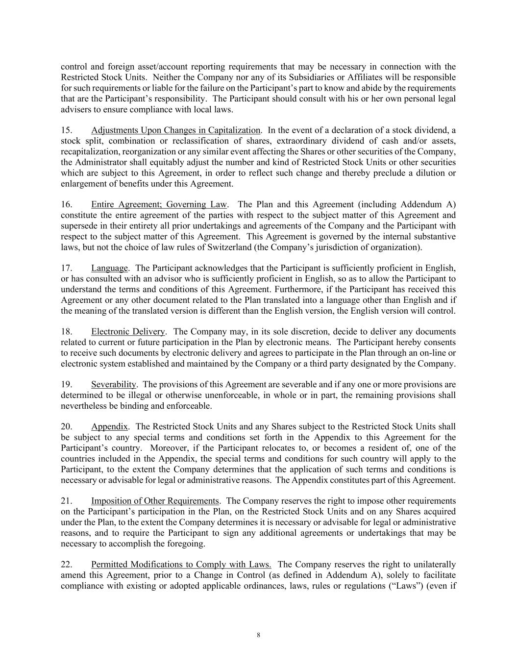 8 control and foreign asset/account reporting requirements that may be necessary in connection with the Restricted Stock Units. Neither the Company nor any of its Subsidiaries or Affiliates will be responsible for such requirements or liable for the failure on the Participant’s part to know and abide by the requirements that are the Participant’s responsibility. The Participant should consult with his or her own personal legal advisers to ensure compliance with local laws. 15. Adjustments Upon Changes in Capitalization. In the event of a declaration of a stock dividend, a stock split, combination or reclassification of shares, extraordinary dividend of cash and/or assets, recapitalization, reorganization or any similar event affecting the Shares or other securities of the Company, the Administrator shall equitably adjust the number and kind of Restricted Stock Units or other securities which are subject to this Agreement, in order to reflect such change and thereby preclude a dilution or enlargement of benefits under this Agreement. 16. Entire Agreement; Governing Law. The Plan and this Agreement (including Addendum A) constitute the entire agreement of the parties with respect to the subject matter of this Agreement and supersede in their entirety all prior undertakings and agreements of the Company and the Participant with respect to the subject matter of this Agreement. This Agreement is governed by the internal substantive laws, but not the choice of law rules of Switzerland (the Company’s jurisdiction of organization). 17. Language. The Participant acknowledges that the Participant is sufficiently proficient in English, or has consulted with an advisor who is sufficiently proficient in English, so as to allow the Participant to understand the terms and conditions of this Agreement. Furthermore, if the Participant has received this Agreement or any other document related to the Plan translated into a language other than English and if the meaning of the translated version is different than the English version, the English version will control. 18. Electronic Delivery. The Company may, in its sole discretion, decide to deliver any documents related to current or future participation in the Plan by electronic means. The Participant hereby consents to receive such documents by electronic delivery and agrees to participate in the Plan through an on-line or electronic system established and maintained by the Company or a third party designated by the Company. 19. Severability. The provisions of this Agreement are severable and if any one or more provisions are determined to be illegal or otherwise unenforceable, in whole or in part, the remaining provisions shall nevertheless be binding and enforceable. 20. Appendix. The Restricted Stock Units and any Shares subject to the Restricted Stock Units shall be subject to any special terms and conditions set forth in the Appendix to this Agreement for the Participant’s country. Moreover, if the Participant relocates to, or becomes a resident of, one of the countries included in the Appendix, the special terms and conditions for such country will apply to the Participant, to the extent the Company determines that the application of such terms and conditions is necessary or advisable for legal or administrative reasons. The Appendix constitutes part of this Agreement. 21. Imposition of Other Requirements. The Company reserves the right to impose other requirements on the Participant’s participation in the Plan, on the Restricted Stock Units and on any Shares acquired under the Plan, to the extent the Company determines it is necessary or advisable for legal or administrative reasons, and to require the Participant to sign any additional agreements or undertakings that may be necessary to accomplish the foregoing. 22. Permitted Modifications to Comply with Laws. The Company reserves the right to unilaterally amend this Agreement, prior to a Change in Control (as defined in Addendum A), solely to facilitate compliance with existing or adopted applicable ordinances, laws, rules or regulations (“Laws”) (even if