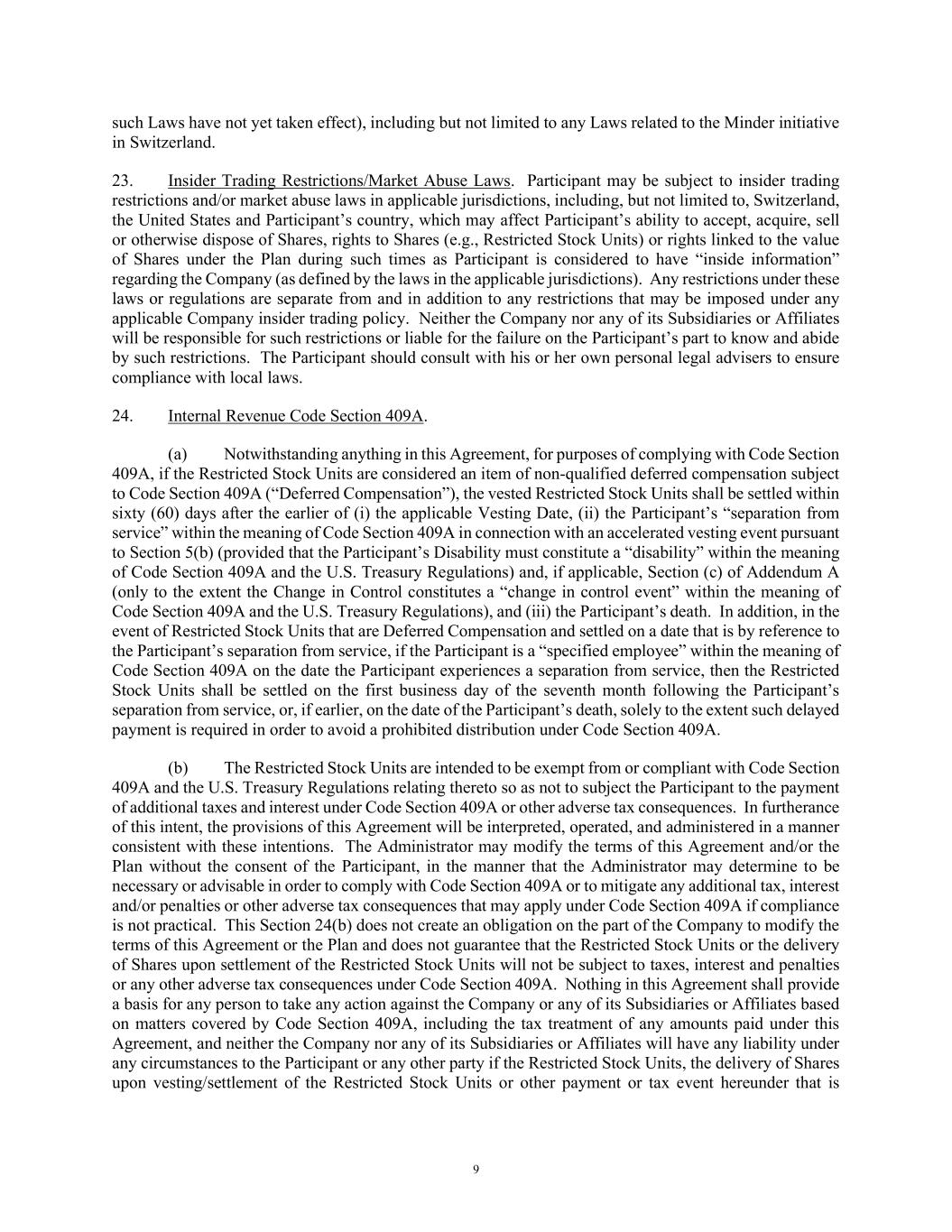 9 such Laws have not yet taken effect), including but not limited to any Laws related to the Minder initiative in Switzerland. 23. Insider Trading Restrictions/Market Abuse Laws. Participant may be subject to insider trading restrictions and/or market abuse laws in applicable jurisdictions, including, but not limited to, Switzerland, the United States and Participant’s country, which may affect Participant’s ability to accept, acquire, sell or otherwise dispose of Shares, rights to Shares (e.g., Restricted Stock Units) or rights linked to the value of Shares under the Plan during such times as Participant is considered to have “inside information” regarding the Company (as defined by the laws in the applicable jurisdictions). Any restrictions under these laws or regulations are separate from and in addition to any restrictions that may be imposed under any applicable Company insider trading policy. Neither the Company nor any of its Subsidiaries or Affiliates will be responsible for such restrictions or liable for the failure on the Participant’s part to know and abide by such restrictions. The Participant should consult with his or her own personal legal advisers to ensure compliance with local laws. 24. Internal Revenue Code Section 409A. (a) Notwithstanding anything in this Agreement, for purposes of complying with Code Section 409A, if the Restricted Stock Units are considered an item of non-qualified deferred compensation subject to Code Section 409A (“Deferred Compensation”), the vested Restricted Stock Units shall be settled within sixty (60) days after the earlier of (i) the applicable Vesting Date, (ii) the Participant’s “separation from service” within the meaning of Code Section 409A in connection with an accelerated vesting event pursuant to Section 5(b) (provided that the Participant’s Disability must constitute a “disability” within the meaning of Code Section 409A and the U.S. Treasury Regulations) and, if applicable, Section (c) of Addendum A (only to the extent the Change in Control constitutes a “change in control event” within the meaning of Code Section 409A and the U.S. Treasury Regulations), and (iii) the Participant’s death. In addition, in the event of Restricted Stock Units that are Deferred Compensation and settled on a date that is by reference to the Participant’s separation from service, if the Participant is a “specified employee” within the meaning of Code Section 409A on the date the Participant experiences a separation from service, then the Restricted Stock Units shall be settled on the first business day of the seventh month following the Participant’s separation from service, or, if earlier, on the date of the Participant’s death, solely to the extent such delayed payment is required in order to avoid a prohibited distribution under Code Section 409A. (b) The Restricted Stock Units are intended to be exempt from or compliant with Code Section 409A and the U.S. Treasury Regulations relating thereto so as not to subject the Participant to the payment of additional taxes and interest under Code Section 409A or other adverse tax consequences. In furtherance of this intent, the provisions of this Agreement will be interpreted, operated, and administered in a manner consistent with these intentions. The Administrator may modify the terms of this Agreement and/or the Plan without the consent of the Participant, in the manner that the Administrator may determine to be necessary or advisable in order to comply with Code Section 409A or to mitigate any additional tax, interest and/or penalties or other adverse tax consequences that may apply under Code Section 409A if compliance is not practical. This Section 24(b) does not create an obligation on the part of the Company to modify the terms of this Agreement or the Plan and does not guarantee that the Restricted Stock Units or the delivery of Shares upon settlement of the Restricted Stock Units will not be subject to taxes, interest and penalties or any other adverse tax consequences under Code Section 409A. Nothing in this Agreement shall provide a basis for any person to take any action against the Company or any of its Subsidiaries or Affiliates based on matters covered by Code Section 409A, including the tax treatment of any amounts paid under this Agreement, and neither the Company nor any of its Subsidiaries or Affiliates will have any liability under any circumstances to the Participant or any other party if the Restricted Stock Units, the delivery of Shares upon vesting/settlement of the Restricted Stock Units or other payment or tax event hereunder that is