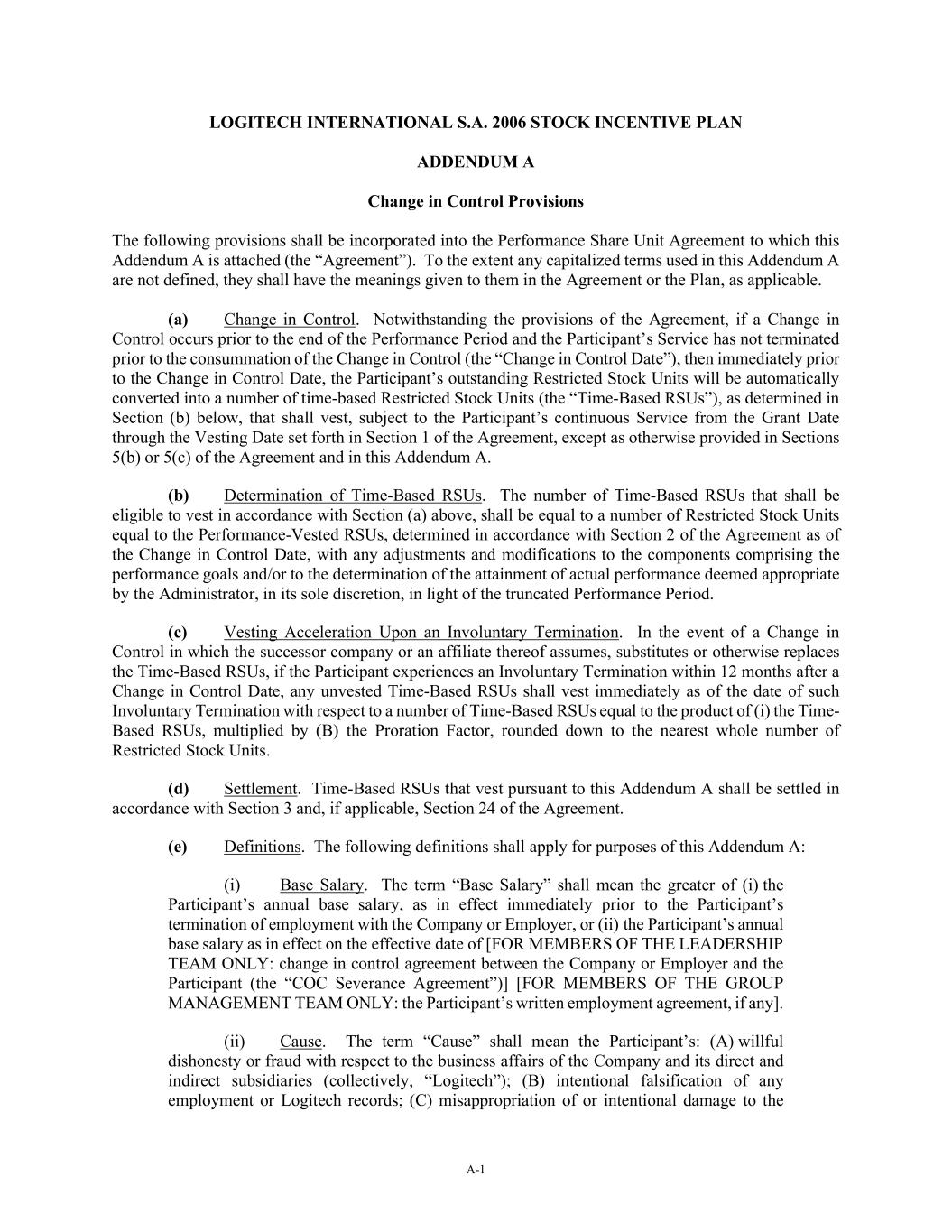 A-1 LOGITECH INTERNATIONAL S.A. 2006 STOCK INCENTIVE PLAN ADDENDUM A Change in Control Provisions The following provisions shall be incorporated into the Performance Share Unit Agreement to which this Addendum A is attached (the “Agreement”). To the extent any capitalized terms used in this Addendum A are not defined, they shall have the meanings given to them in the Agreement or the Plan, as applicable. (a) Change in Control. Notwithstanding the provisions of the Agreement, if a Change in Control occurs prior to the end of the Performance Period and the Participant’s Service has not terminated prior to the consummation of the Change in Control (the “Change in Control Date”), then immediately prior to the Change in Control Date, the Participant’s outstanding Restricted Stock Units will be automatically converted into a number of time-based Restricted Stock Units (the “Time-Based RSUs”), as determined in Section (b) below, that shall vest, subject to the Participant’s continuous Service from the Grant Date through the Vesting Date set forth in Section 1 of the Agreement, except as otherwise provided in Sections 5(b) or 5(c) of the Agreement and in this Addendum A. (b) Determination of Time-Based RSUs. The number of Time-Based RSUs that shall be eligible to vest in accordance with Section (a) above, shall be equal to a number of Restricted Stock Units equal to the Performance-Vested RSUs, determined in accordance with Section 2 of the Agreement as of the Change in Control Date, with any adjustments and modifications to the components comprising the performance goals and/or to the determination of the attainment of actual performance deemed appropriate by the Administrator, in its sole discretion, in light of the truncated Performance Period. (c) Vesting Acceleration Upon an Involuntary Termination. In the event of a Change in Control in which the successor company or an affiliate thereof assumes, substitutes or otherwise replaces the Time-Based RSUs, if the Participant experiences an Involuntary Termination within 12 months after a Change in Control Date, any unvested Time-Based RSUs shall vest immediately as of the date of such Involuntary Termination with respect to a number of Time-Based RSUs equal to the product of (i) the Time- Based RSUs, multiplied by (B) the Proration Factor, rounded down to the nearest whole number of Restricted Stock Units. (d) Settlement. Time-Based RSUs that vest pursuant to this Addendum A shall be settled in accordance with Section 3 and, if applicable, Section 24 of the Agreement. (e) Definitions. The following definitions shall apply for purposes of this Addendum A: (i) Base Salary. The term “Base Salary” shall mean the greater of (i) the Participant’s annual base salary, as in effect immediately prior to the Participant’s termination of employment with the Company or Employer, or (ii) the Participant’s annual base salary as in effect on the effective date of [FOR MEMBERS OF THE LEADERSHIP TEAM ONLY: change in control agreement between the Company or Employer and the Participant (the “COC Severance Agreement”)] [FOR MEMBERS OF THE GROUP MANAGEMENT TEAM ONLY: the Participant’s written employment agreement, if any]. (ii) Cause. The term “Cause” shall mean the Participant’s: (A) willful dishonesty or fraud with respect to the business affairs of the Company and its direct and indirect subsidiaries (collectively, “Logitech”); (B) intentional falsification of any employment or Logitech records; (C) misappropriation of or intentional damage to the