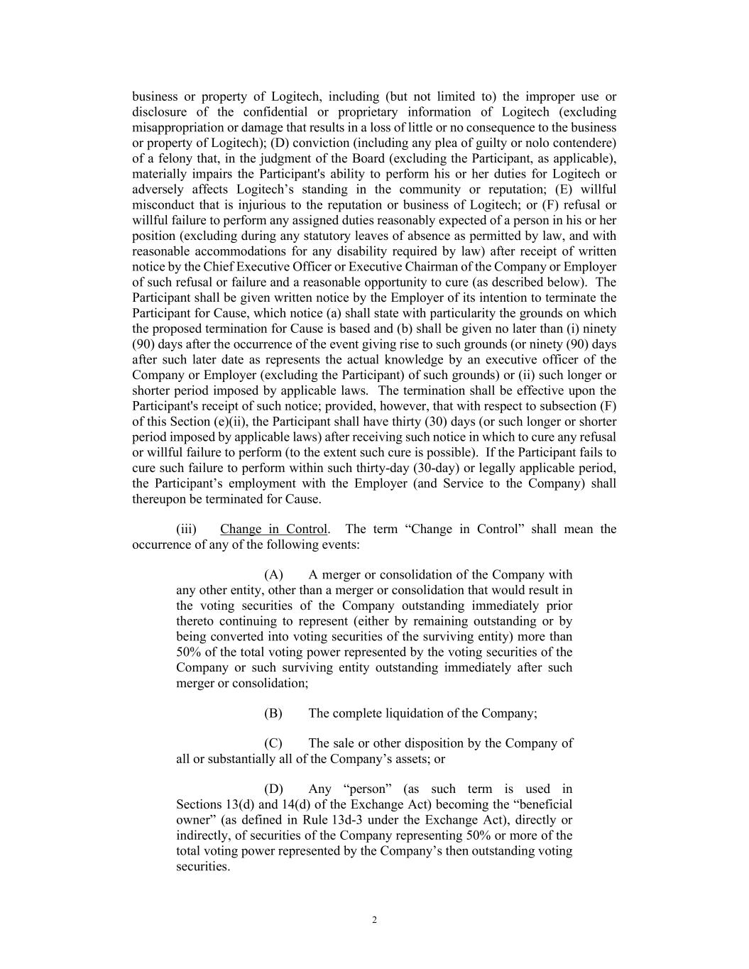 2 business or property of Logitech, including (but not limited to) the improper use or disclosure of the confidential or proprietary information of Logitech (excluding misappropriation or damage that results in a loss of little or no consequence to the business or property of Logitech); (D) conviction (including any plea of guilty or nolo contendere) of a felony that, in the judgment of the Board (excluding the Participant, as applicable), materially impairs the Participant's ability to perform his or her duties for Logitech or adversely affects Logitech’s standing in the community or reputation; (E) willful misconduct that is injurious to the reputation or business of Logitech; or (F) refusal or willful failure to perform any assigned duties reasonably expected of a person in his or her position (excluding during any statutory leaves of absence as permitted by law, and with reasonable accommodations for any disability required by law) after receipt of written notice by the Chief Executive Officer or Executive Chairman of the Company or Employer of such refusal or failure and a reasonable opportunity to cure (as described below). The Participant shall be given written notice by the Employer of its intention to terminate the Participant for Cause, which notice (a) shall state with particularity the grounds on which the proposed termination for Cause is based and (b) shall be given no later than (i) ninety (90) days after the occurrence of the event giving rise to such grounds (or ninety (90) days after such later date as represents the actual knowledge by an executive officer of the Company or Employer (excluding the Participant) of such grounds) or (ii) such longer or shorter period imposed by applicable laws. The termination shall be effective upon the Participant's receipt of such notice; provided, however, that with respect to subsection (F) of this Section (e)(ii), the Participant shall have thirty (30) days (or such longer or shorter period imposed by applicable laws) after receiving such notice in which to cure any refusal or willful failure to perform (to the extent such cure is possible). If the Participant fails to cure such failure to perform within such thirty-day (30-day) or legally applicable period, the Participant’s employment with the Employer (and Service to the Company) shall thereupon be terminated for Cause. (iii) Change in Control. The term “Change in Control” shall mean the occurrence of any of the following events: (A) A merger or consolidation of the Company with any other entity, other than a merger or consolidation that would result in the voting securities of the Company outstanding immediately prior thereto continuing to represent (either by remaining outstanding or by being converted into voting securities of the surviving entity) more than 50% of the total voting power represented by the voting securities of the Company or such surviving entity outstanding immediately after such merger or consolidation; (B) The complete liquidation of the Company; (C) The sale or other disposition by the Company of all or substantially all of the Company’s assets; or (D) Any “person” (as such term is used in Sections 13(d) and 14(d) of the Exchange Act) becoming the “beneficial owner” (as defined in Rule 13d-3 under the Exchange Act), directly or indirectly, of securities of the Company representing 50% or more of the total voting power represented by the Company’s then outstanding voting securities.
