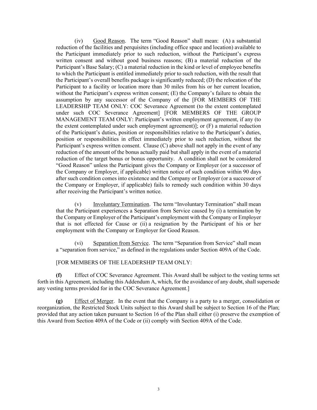 3 (iv) Good Reason. The term “Good Reason” shall mean: (A) a substantial reduction of the facilities and perquisites (including office space and location) available to the Participant immediately prior to such reduction, without the Participant’s express written consent and without good business reasons; (B) a material reduction of the Participant’s Base Salary; (C) a material reduction in the kind or level of employee benefits to which the Participant is entitled immediately prior to such reduction, with the result that the Participant’s overall benefits package is significantly reduced; (D) the relocation of the Participant to a facility or location more than 30 miles from his or her current location, without the Participant’s express written consent; (E) the Company’s failure to obtain the assumption by any successor of the Company of the [FOR MEMBERS OF THE LEADERSHIP TEAM ONLY: COC Severance Agreement (to the extent contemplated under such COC Severance Agreement] [FOR MEMBERS OF THE GROUP MANAGEMENT TEAM ONLY: Participant’s written employment agreement, if any (to the extent contemplated under such employment agreement)]; or (F) a material reduction of the Participant’s duties, position or responsibilities relative to the Participant’s duties, position or responsibilities in effect immediately prior to such reduction, without the Participant’s express written consent. Clause (C) above shall not apply in the event of any reduction of the amount of the bonus actually paid but shall apply in the event of a material reduction of the target bonus or bonus opportunity. A condition shall not be considered “Good Reason” unless the Participant gives the Company or Employer (or a successor of the Company or Employer, if applicable) written notice of such condition within 90 days after such condition comes into existence and the Company or Employer (or a successor of the Company or Employer, if applicable) fails to remedy such condition within 30 days after receiving the Participant’s written notice. (v) Involuntary Termination. The term “Involuntary Termination” shall mean that the Participant experiences a Separation from Service caused by (i) a termination by the Company or Employer of the Participant’s employment with the Company or Employer that is not effected for Cause or (ii) a resignation by the Participant of his or her employment with the Company or Employer for Good Reason. (vi) Separation from Service. The term “Separation from Service” shall mean a “separation from service,” as defined in the regulations under Section 409A of the Code. [FOR MEMBERS OF THE LEADERSHIP TEAM ONLY: (f) Effect of COC Severance Agreement. This Award shall be subject to the vesting terms set forth in this Agreement, including this Addendum A, which, for the avoidance of any doubt, shall supersede any vesting terms provided for in the COC Severance Agreement.] (g) Effect of Merger. In the event that the Company is a party to a merger, consolidation or reorganization, the Restricted Stock Units subject to this Award shall be subject to Section 16 of the Plan; provided that any action taken pursuant to Section 16 of the Plan shall either (i) preserve the exemption of this Award from Section 409A of the Code or (ii) comply with Section 409A of the Code.