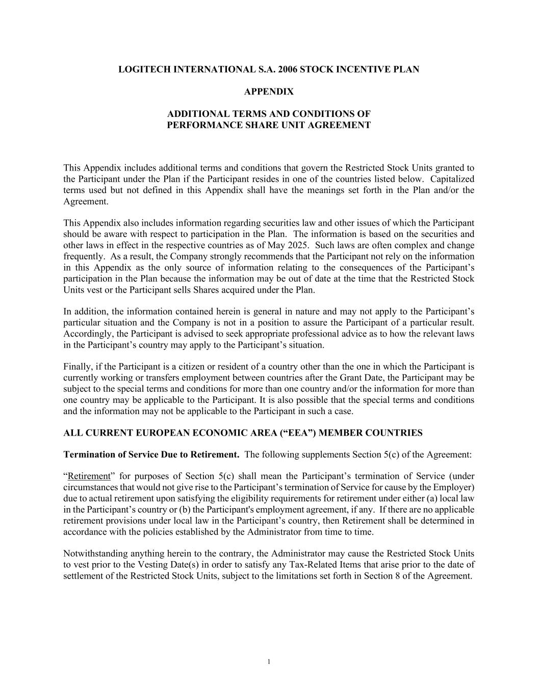 1 LOGITECH INTERNATIONAL S.A. 2006 STOCK INCENTIVE PLAN APPENDIX ADDITIONAL TERMS AND CONDITIONS OF PERFORMANCE SHARE UNIT AGREEMENT This Appendix includes additional terms and conditions that govern the Restricted Stock Units granted to the Participant under the Plan if the Participant resides in one of the countries listed below. Capitalized terms used but not defined in this Appendix shall have the meanings set forth in the Plan and/or the Agreement. This Appendix also includes information regarding securities law and other issues of which the Participant should be aware with respect to participation in the Plan. The information is based on the securities and other laws in effect in the respective countries as of May 2025. Such laws are often complex and change frequently. As a result, the Company strongly recommends that the Participant not rely on the information in this Appendix as the only source of information relating to the consequences of the Participant’s participation in the Plan because the information may be out of date at the time that the Restricted Stock Units vest or the Participant sells Shares acquired under the Plan. In addition, the information contained herein is general in nature and may not apply to the Participant’s particular situation and the Company is not in a position to assure the Participant of a particular result. Accordingly, the Participant is advised to seek appropriate professional advice as to how the relevant laws in the Participant’s country may apply to the Participant’s situation. Finally, if the Participant is a citizen or resident of a country other than the one in which the Participant is currently working or transfers employment between countries after the Grant Date, the Participant may be subject to the special terms and conditions for more than one country and/or the information for more than one country may be applicable to the Participant. It is also possible that the special terms and conditions and the information may not be applicable to the Participant in such a case. ALL CURRENT EUROPEAN ECONOMIC AREA (“EEA”) MEMBER COUNTRIES Termination of Service Due to Retirement. The following supplements Section 5(c) of the Agreement: “Retirement” for purposes of Section 5(c) shall mean the Participant’s termination of Service (under circumstances that would not give rise to the Participant’s termination of Service for cause by the Employer) due to actual retirement upon satisfying the eligibility requirements for retirement under either (a) local law in the Participant’s country or (b) the Participant's employment agreement, if any. If there are no applicable retirement provisions under local law in the Participant’s country, then Retirement shall be determined in accordance with the policies established by the Administrator from time to time. Notwithstanding anything herein to the contrary, the Administrator may cause the Restricted Stock Units to vest prior to the Vesting Date(s) in order to satisfy any Tax-Related Items that arise prior to the date of settlement of the Restricted Stock Units, subject to the limitations set forth in Section 8 of the Agreement.