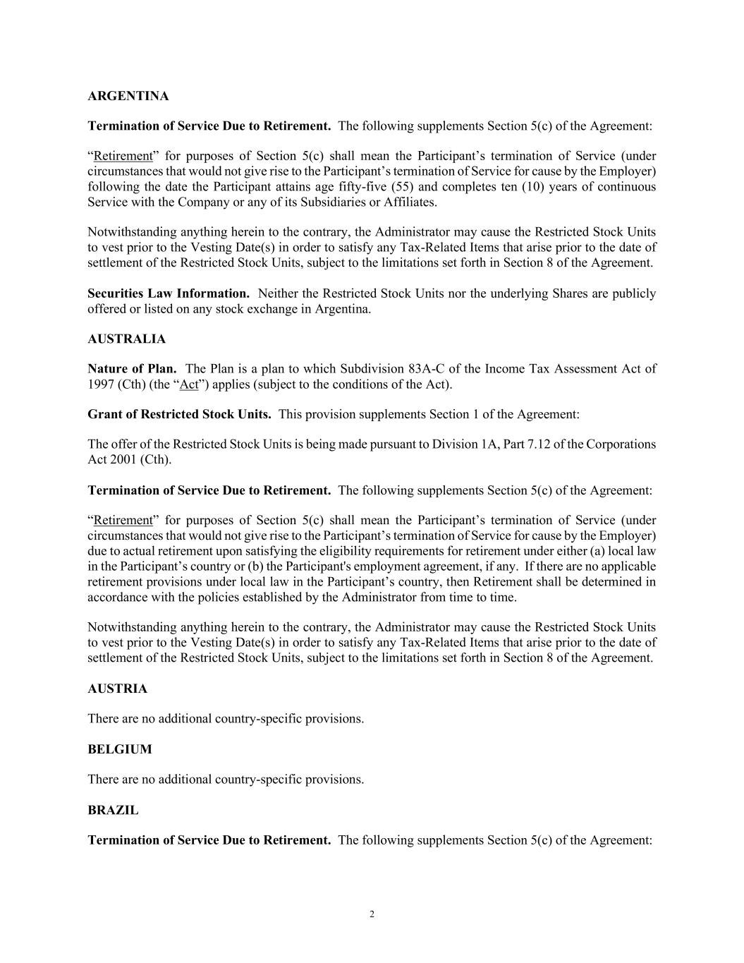 2 ARGENTINA Termination of Service Due to Retirement. The following supplements Section 5(c) of the Agreement: “Retirement” for purposes of Section 5(c) shall mean the Participant’s termination of Service (under circumstances that would not give rise to the Participant’s termination of Service for cause by the Employer) following the date the Participant attains age fifty-five (55) and completes ten (10) years of continuous Service with the Company or any of its Subsidiaries or Affiliates. Notwithstanding anything herein to the contrary, the Administrator may cause the Restricted Stock Units to vest prior to the Vesting Date(s) in order to satisfy any Tax-Related Items that arise prior to the date of settlement of the Restricted Stock Units, subject to the limitations set forth in Section 8 of the Agreement. Securities Law Information. Neither the Restricted Stock Units nor the underlying Shares are publicly offered or listed on any stock exchange in Argentina. AUSTRALIA Nature of Plan. The Plan is a plan to which Subdivision 83A-C of the Income Tax Assessment Act of 1997 (Cth) (the “Act”) applies (subject to the conditions of the Act). Grant of Restricted Stock Units. This provision supplements Section 1 of the Agreement: The offer of the Restricted Stock Units is being made pursuant to Division 1A, Part 7.12 of the Corporations Act 2001 (Cth). Termination of Service Due to Retirement. The following supplements Section 5(c) of the Agreement: “Retirement” for purposes of Section 5(c) shall mean the Participant’s termination of Service (under circumstances that would not give rise to the Participant’s termination of Service for cause by the Employer) due to actual retirement upon satisfying the eligibility requirements for retirement under either (a) local law in the Participant’s country or (b) the Participant's employment agreement, if any. If there are no applicable retirement provisions under local law in the Participant’s country, then Retirement shall be determined in accordance with the policies established by the Administrator from time to time. Notwithstanding anything herein to the contrary, the Administrator may cause the Restricted Stock Units to vest prior to the Vesting Date(s) in order to satisfy any Tax-Related Items that arise prior to the date of settlement of the Restricted Stock Units, subject to the limitations set forth in Section 8 of the Agreement. AUSTRIA There are no additional country-specific provisions. BELGIUM There are no additional country-specific provisions. BRAZIL Termination of Service Due to Retirement. The following supplements Section 5(c) of the Agreement: