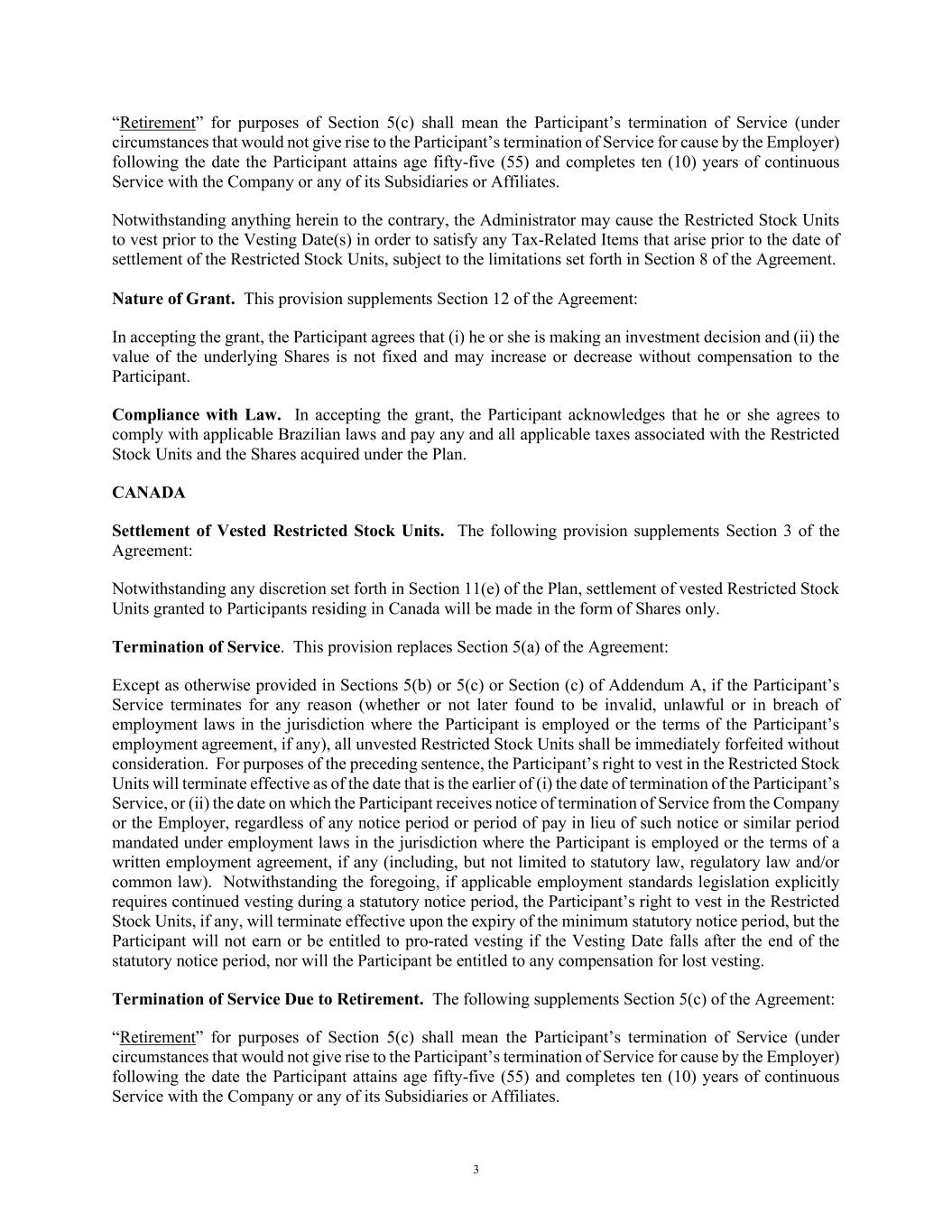3 “Retirement” for purposes of Section 5(c) shall mean the Participant’s termination of Service (under circumstances that would not give rise to the Participant’s termination of Service for cause by the Employer) following the date the Participant attains age fifty-five (55) and completes ten (10) years of continuous Service with the Company or any of its Subsidiaries or Affiliates. Notwithstanding anything herein to the contrary, the Administrator may cause the Restricted Stock Units to vest prior to the Vesting Date(s) in order to satisfy any Tax-Related Items that arise prior to the date of settlement of the Restricted Stock Units, subject to the limitations set forth in Section 8 of the Agreement. Nature of Grant. This provision supplements Section 12 of the Agreement: In accepting the grant, the Participant agrees that (i) he or she is making an investment decision and (ii) the value of the underlying Shares is not fixed and may increase or decrease without compensation to the Participant. Compliance with Law. In accepting the grant, the Participant acknowledges that he or she agrees to comply with applicable Brazilian laws and pay any and all applicable taxes associated with the Restricted Stock Units and the Shares acquired under the Plan. CANADA Settlement of Vested Restricted Stock Units. The following provision supplements Section 3 of the Agreement: Notwithstanding any discretion set forth in Section 11(e) of the Plan, settlement of vested Restricted Stock Units granted to Participants residing in Canada will be made in the form of Shares only. Termination of Service. This provision replaces Section 5(a) of the Agreement: Except as otherwise provided in Sections 5(b) or 5(c) or Section (c) of Addendum A, if the Participant’s Service terminates for any reason (whether or not later found to be invalid, unlawful or in breach of employment laws in the jurisdiction where the Participant is employed or the terms of the Participant’s employment agreement, if any), all unvested Restricted Stock Units shall be immediately forfeited without consideration. For purposes of the preceding sentence, the Participant’s right to vest in the Restricted Stock Units will terminate effective as of the date that is the earlier of (i) the date of termination of the Participant’s Service, or (ii) the date on which the Participant receives notice of termination of Service from the Company or the Employer, regardless of any notice period or period of pay in lieu of such notice or similar period mandated under employment laws in the jurisdiction where the Participant is employed or the terms of a written employment agreement, if any (including, but not limited to statutory law, regulatory law and/or common law). Notwithstanding the foregoing, if applicable employment standards legislation explicitly requires continued vesting during a statutory notice period, the Participant’s right to vest in the Restricted Stock Units, if any, will terminate effective upon the expiry of the minimum statutory notice period, but the Participant will not earn or be entitled to pro-rated vesting if the Vesting Date falls after the end of the statutory notice period, nor will the Participant be entitled to any compensation for lost vesting. Termination of Service Due to Retirement. The following supplements Section 5(c) of the Agreement: “Retirement” for purposes of Section 5(c) shall mean the Participant’s termination of Service (under circumstances that would not give rise to the Participant’s termination of Service for cause by the Employer) following the date the Participant attains age fifty-five (55) and completes ten (10) years of continuous Service with the Company or any of its Subsidiaries or Affiliates.