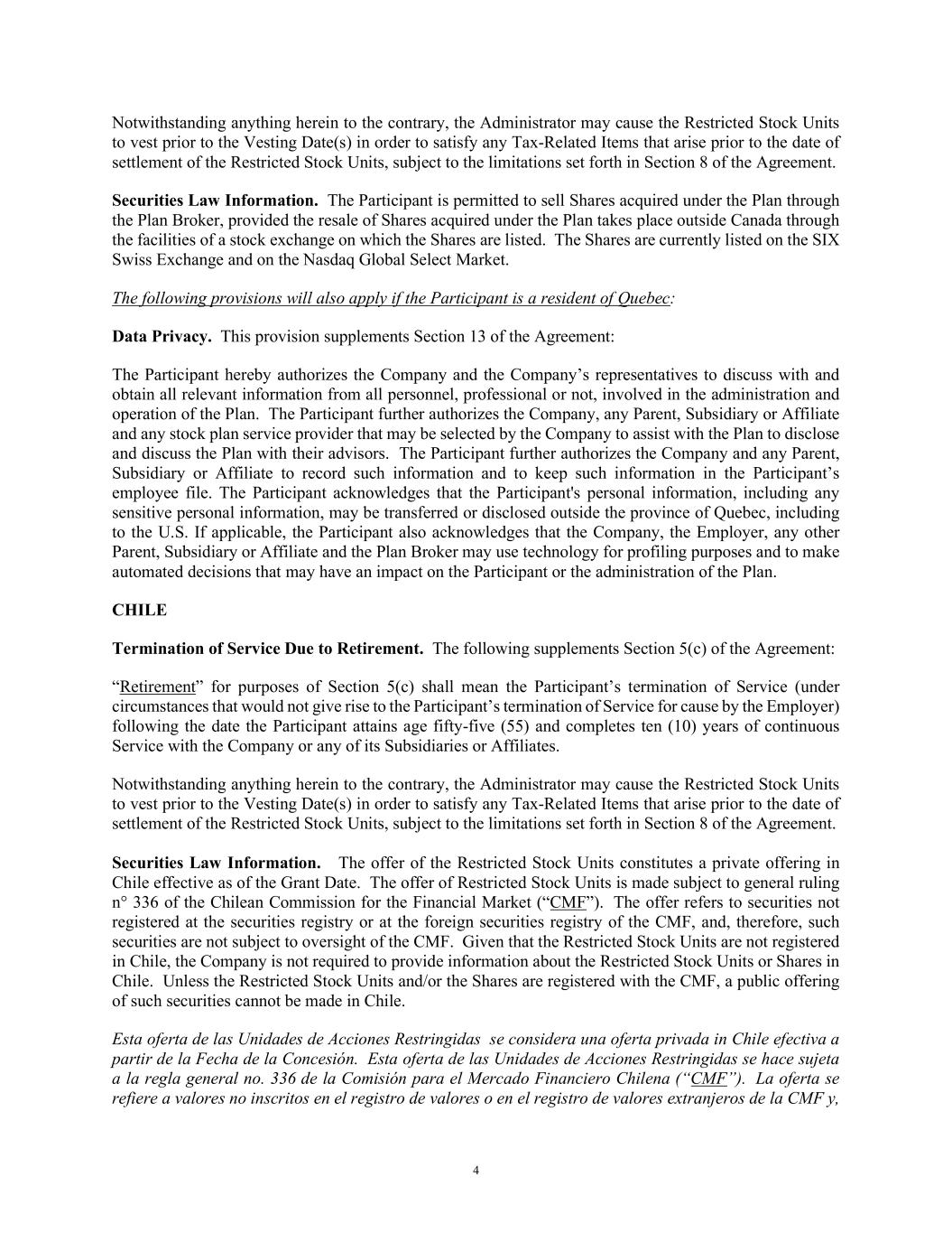4 Notwithstanding anything herein to the contrary, the Administrator may cause the Restricted Stock Units to vest prior to the Vesting Date(s) in order to satisfy any Tax-Related Items that arise prior to the date of settlement of the Restricted Stock Units, subject to the limitations set forth in Section 8 of the Agreement. Securities Law Information. The Participant is permitted to sell Shares acquired under the Plan through the Plan Broker, provided the resale of Shares acquired under the Plan takes place outside Canada through the facilities of a stock exchange on which the Shares are listed. The Shares are currently listed on the SIX Swiss Exchange and on the Nasdaq Global Select Market. The following provisions will also apply if the Participant is a resident of Quebec: Data Privacy. This provision supplements Section 13 of the Agreement: The Participant hereby authorizes the Company and the Company’s representatives to discuss with and obtain all relevant information from all personnel, professional or not, involved in the administration and operation of the Plan. The Participant further authorizes the Company, any Parent, Subsidiary or Affiliate and any stock plan service provider that may be selected by the Company to assist with the Plan to disclose and discuss the Plan with their advisors. The Participant further authorizes the Company and any Parent, Subsidiary or Affiliate to record such information and to keep such information in the Participant’s employee file. The Participant acknowledges that the Participant's personal information, including any sensitive personal information, may be transferred or disclosed outside the province of Quebec, including to the U.S. If applicable, the Participant also acknowledges that the Company, the Employer, any other Parent, Subsidiary or Affiliate and the Plan Broker may use technology for profiling purposes and to make automated decisions that may have an impact on the Participant or the administration of the Plan. CHILE Termination of Service Due to Retirement. The following supplements Section 5(c) of the Agreement: “Retirement” for purposes of Section 5(c) shall mean the Participant’s termination of Service (under circumstances that would not give rise to the Participant’s termination of Service for cause by the Employer) following the date the Participant attains age fifty-five (55) and completes ten (10) years of continuous Service with the Company or any of its Subsidiaries or Affiliates. Notwithstanding anything herein to the contrary, the Administrator may cause the Restricted Stock Units to vest prior to the Vesting Date(s) in order to satisfy any Tax-Related Items that arise prior to the date of settlement of the Restricted Stock Units, subject to the limitations set forth in Section 8 of the Agreement. Securities Law Information. The offer of the Restricted Stock Units constitutes a private offering in Chile effective as of the Grant Date. The offer of Restricted Stock Units is made subject to general ruling n° 336 of the Chilean Commission for the Financial Market (“CMF”). The offer refers to securities not registered at the securities registry or at the foreign securities registry of the CMF, and, therefore, such securities are not subject to oversight of the CMF. Given that the Restricted Stock Units are not registered in Chile, the Company is not required to provide information about the Restricted Stock Units or Shares in Chile. Unless the Restricted Stock Units and/or the Shares are registered with the CMF, a public offering of such securities cannot be made in Chile. Esta oferta de las Unidades de Acciones Restringidas se considera una oferta privada in Chile efectiva a partir de la Fecha de la Concesión. Esta oferta de las Unidades de Acciones Restringidas se hace sujeta a la regla general no. 336 de la Comisión para el Mercado Financiero Chilena (“CMF”). La oferta se refiere a valores no inscritos en el registro de valores o en el registro de valores extranjeros de la CMF y,