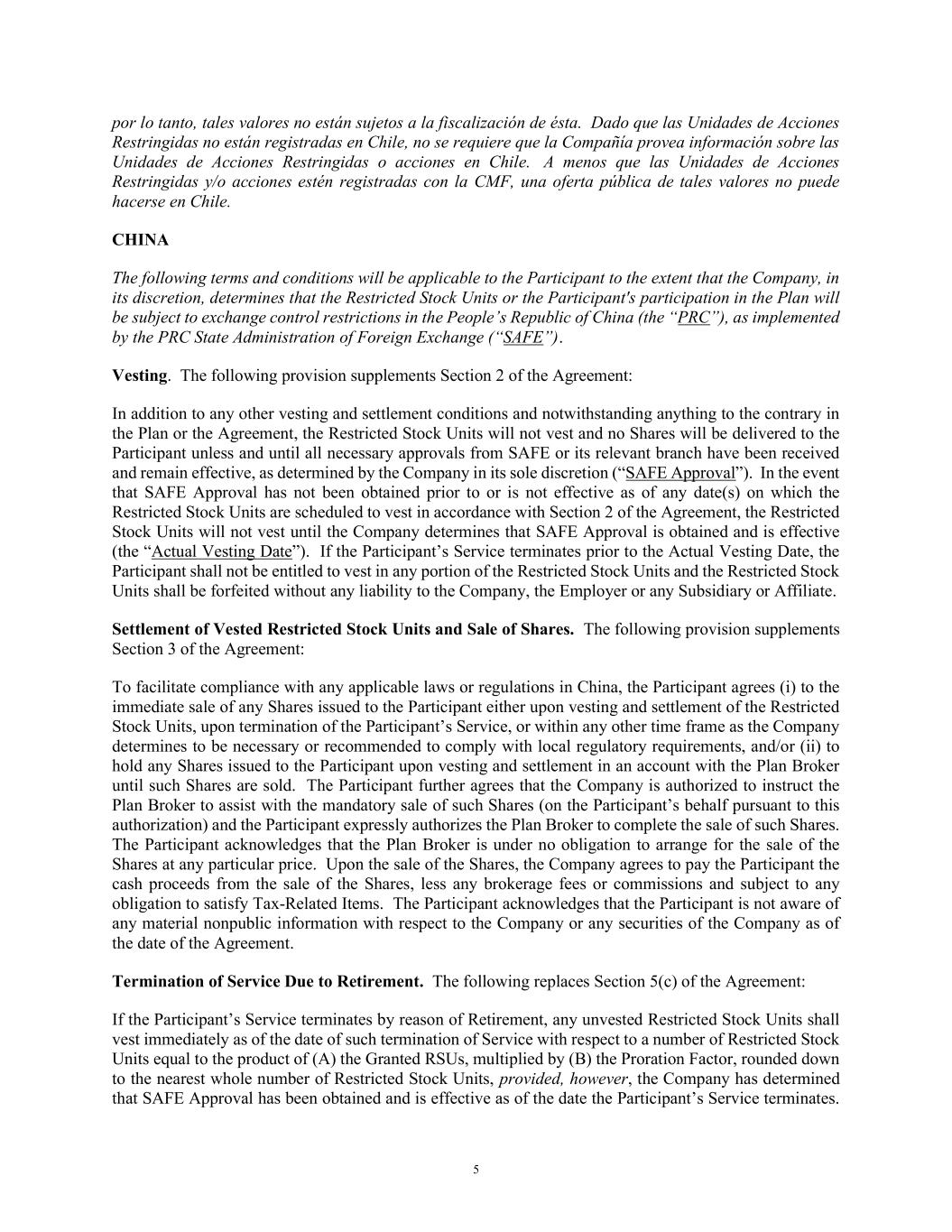 5 por lo tanto, tales valores no están sujetos a la fiscalización de ésta. Dado que las Unidades de Acciones Restringidas no están registradas en Chile, no se requiere que la Compañía provea información sobre las Unidades de Acciones Restringidas o acciones en Chile. A menos que las Unidades de Acciones Restringidas y/o acciones estén registradas con la CMF, una oferta pública de tales valores no puede hacerse en Chile. CHINA The following terms and conditions will be applicable to the Participant to the extent that the Company, in its discretion, determines that the Restricted Stock Units or the Participant's participation in the Plan will be subject to exchange control restrictions in the People’s Republic of China (the “PRC”), as implemented by the PRC State Administration of Foreign Exchange (“SAFE”). Vesting. The following provision supplements Section 2 of the Agreement: In addition to any other vesting and settlement conditions and notwithstanding anything to the contrary in the Plan or the Agreement, the Restricted Stock Units will not vest and no Shares will be delivered to the Participant unless and until all necessary approvals from SAFE or its relevant branch have been received and remain effective, as determined by the Company in its sole discretion (“SAFE Approval”). In the event that SAFE Approval has not been obtained prior to or is not effective as of any date(s) on which the Restricted Stock Units are scheduled to vest in accordance with Section 2 of the Agreement, the Restricted Stock Units will not vest until the Company determines that SAFE Approval is obtained and is effective (the “Actual Vesting Date”). If the Participant’s Service terminates prior to the Actual Vesting Date, the Participant shall not be entitled to vest in any portion of the Restricted Stock Units and the Restricted Stock Units shall be forfeited without any liability to the Company, the Employer or any Subsidiary or Affiliate. Settlement of Vested Restricted Stock Units and Sale of Shares. The following provision supplements Section 3 of the Agreement: To facilitate compliance with any applicable laws or regulations in China, the Participant agrees (i) to the immediate sale of any Shares issued to the Participant either upon vesting and settlement of the Restricted Stock Units, upon termination of the Participant’s Service, or within any other time frame as the Company determines to be necessary or recommended to comply with local regulatory requirements, and/or (ii) to hold any Shares issued to the Participant upon vesting and settlement in an account with the Plan Broker until such Shares are sold. The Participant further agrees that the Company is authorized to instruct the Plan Broker to assist with the mandatory sale of such Shares (on the Participant’s behalf pursuant to this authorization) and the Participant expressly authorizes the Plan Broker to complete the sale of such Shares. The Participant acknowledges that the Plan Broker is under no obligation to arrange for the sale of the Shares at any particular price. Upon the sale of the Shares, the Company agrees to pay the Participant the cash proceeds from the sale of the Shares, less any brokerage fees or commissions and subject to any obligation to satisfy Tax-Related Items. The Participant acknowledges that the Participant is not aware of any material nonpublic information with respect to the Company or any securities of the Company as of the date of the Agreement. Termination of Service Due to Retirement. The following replaces Section 5(c) of the Agreement: If the Participant’s Service terminates by reason of Retirement, any unvested Restricted Stock Units shall vest immediately as of the date of such termination of Service with respect to a number of Restricted Stock Units equal to the product of (A) the Granted RSUs, multiplied by (B) the Proration Factor, rounded down to the nearest whole number of Restricted Stock Units, provided, however, the Company has determined that SAFE Approval has been obtained and is effective as of the date the Participant’s Service terminates.