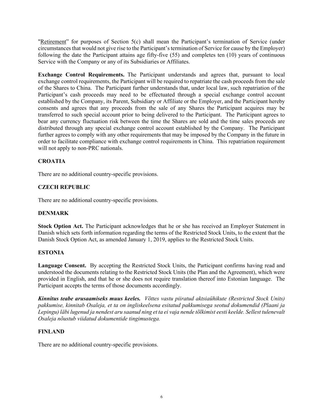 6 "Retirement” for purposes of Section 5(c) shall mean the Participant’s termination of Service (under circumstances that would not give rise to the Participant’s termination of Service for cause by the Employer) following the date the Participant attains age fifty-five (55) and completes ten (10) years of continuous Service with the Company or any of its Subsidiaries or Affiliates. Exchange Control Requirements. The Participant understands and agrees that, pursuant to local exchange control requirements, the Participant will be required to repatriate the cash proceeds from the sale of the Shares to China. The Participant further understands that, under local law, such repatriation of the Participant’s cash proceeds may need to be effectuated through a special exchange control account established by the Company, its Parent, Subsidiary or Affiliate or the Employer, and the Participant hereby consents and agrees that any proceeds from the sale of any Shares the Participant acquires may be transferred to such special account prior to being delivered to the Participant. The Participant agrees to bear any currency fluctuation risk between the time the Shares are sold and the time sales proceeds are distributed through any special exchange control account established by the Company. The Participant further agrees to comply with any other requirements that may be imposed by the Company in the future in order to facilitate compliance with exchange control requirements in China. This repatriation requirement will not apply to non-PRC nationals. CROATIA There are no additional country-specific provisions. CZECH REPUBLIC There are no additional country-specific provisions. DENMARK Stock Option Act. The Participant acknowledges that he or she has received an Employer Statement in Danish which sets forth information regarding the terms of the Restricted Stock Units, to the extent that the Danish Stock Option Act, as amended January 1, 2019, applies to the Restricted Stock Units. ESTONIA Language Consent. By accepting the Restricted Stock Units, the Participant confirms having read and understood the documents relating to the Restricted Stock Units (the Plan and the Agreement), which were provided in English, and that he or she does not require translation thereof into Estonian language. The Participant accepts the terms of those documents accordingly. Kinnitus teabe arusaamiseks muus keeles. Võttes vastu piiratud aktsiaühikute (Restricted Stock Units) pakkumise, kinnitab Osaleja, et ta on ingliskeelsena esitatud pakkumisega seotud dokumendid (Plaani ja Lepingu) läbi lugenud ja nendest aru saanud ning et ta ei vaja nende tõlkimist eesti keelde. Sellest tulenevalt Osaleja nõustub viidatud dokumentide tingimustega. FINLAND There are no additional country-specific provisions.