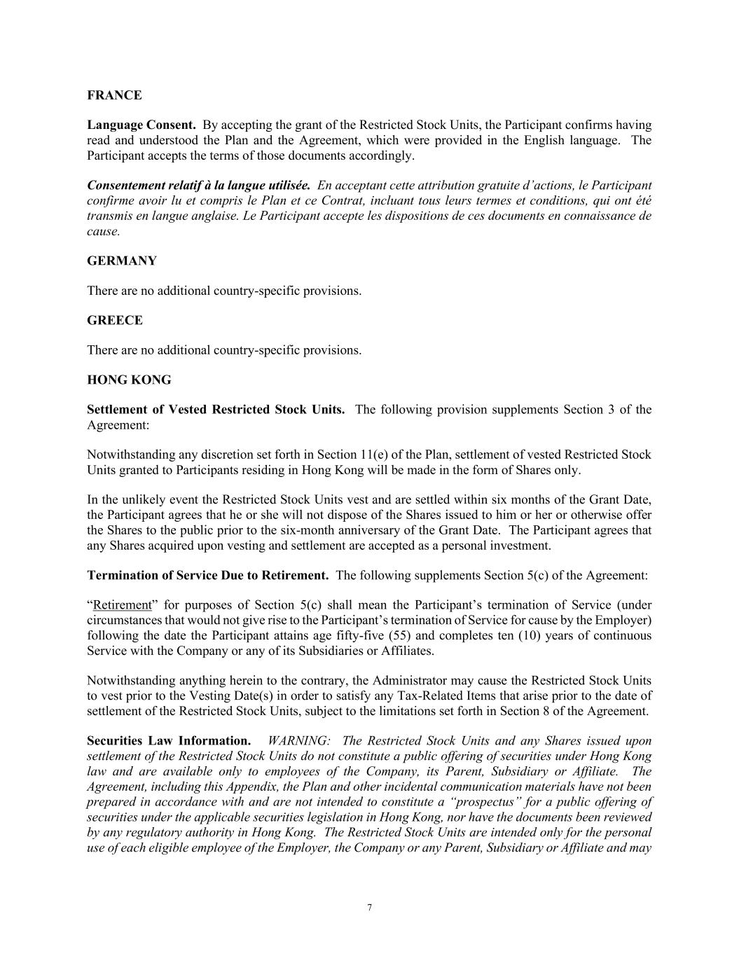 7 FRANCE Language Consent. By accepting the grant of the Restricted Stock Units, the Participant confirms having read and understood the Plan and the Agreement, which were provided in the English language. The Participant accepts the terms of those documents accordingly. Consentement relatif à la langue utilisée. En acceptant cette attribution gratuite d’actions, le Participant confirme avoir lu et compris le Plan et ce Contrat, incluant tous leurs termes et conditions, qui ont été transmis en langue anglaise. Le Participant accepte les dispositions de ces documents en connaissance de cause. GERMANY There are no additional country-specific provisions. GREECE There are no additional country-specific provisions. HONG KONG Settlement of Vested Restricted Stock Units. The following provision supplements Section 3 of the Agreement: Notwithstanding any discretion set forth in Section 11(e) of the Plan, settlement of vested Restricted Stock Units granted to Participants residing in Hong Kong will be made in the form of Shares only. In the unlikely event the Restricted Stock Units vest and are settled within six months of the Grant Date, the Participant agrees that he or she will not dispose of the Shares issued to him or her or otherwise offer the Shares to the public prior to the six-month anniversary of the Grant Date. The Participant agrees that any Shares acquired upon vesting and settlement are accepted as a personal investment. Termination of Service Due to Retirement. The following supplements Section 5(c) of the Agreement: “Retirement” for purposes of Section 5(c) shall mean the Participant’s termination of Service (under circumstances that would not give rise to the Participant’s termination of Service for cause by the Employer) following the date the Participant attains age fifty-five (55) and completes ten (10) years of continuous Service with the Company or any of its Subsidiaries or Affiliates. Notwithstanding anything herein to the contrary, the Administrator may cause the Restricted Stock Units to vest prior to the Vesting Date(s) in order to satisfy any Tax-Related Items that arise prior to the date of settlement of the Restricted Stock Units, subject to the limitations set forth in Section 8 of the Agreement. Securities Law Information. WARNING: The Restricted Stock Units and any Shares issued upon settlement of the Restricted Stock Units do not constitute a public offering of securities under Hong Kong law and are available only to employees of the Company, its Parent, Subsidiary or Affiliate. The Agreement, including this Appendix, the Plan and other incidental communication materials have not been prepared in accordance with and are not intended to constitute a “prospectus” for a public offering of securities under the applicable securities legislation in Hong Kong, nor have the documents been reviewed by any regulatory authority in Hong Kong. The Restricted Stock Units are intended only for the personal use of each eligible employee of the Employer, the Company or any Parent, Subsidiary or Affiliate and may